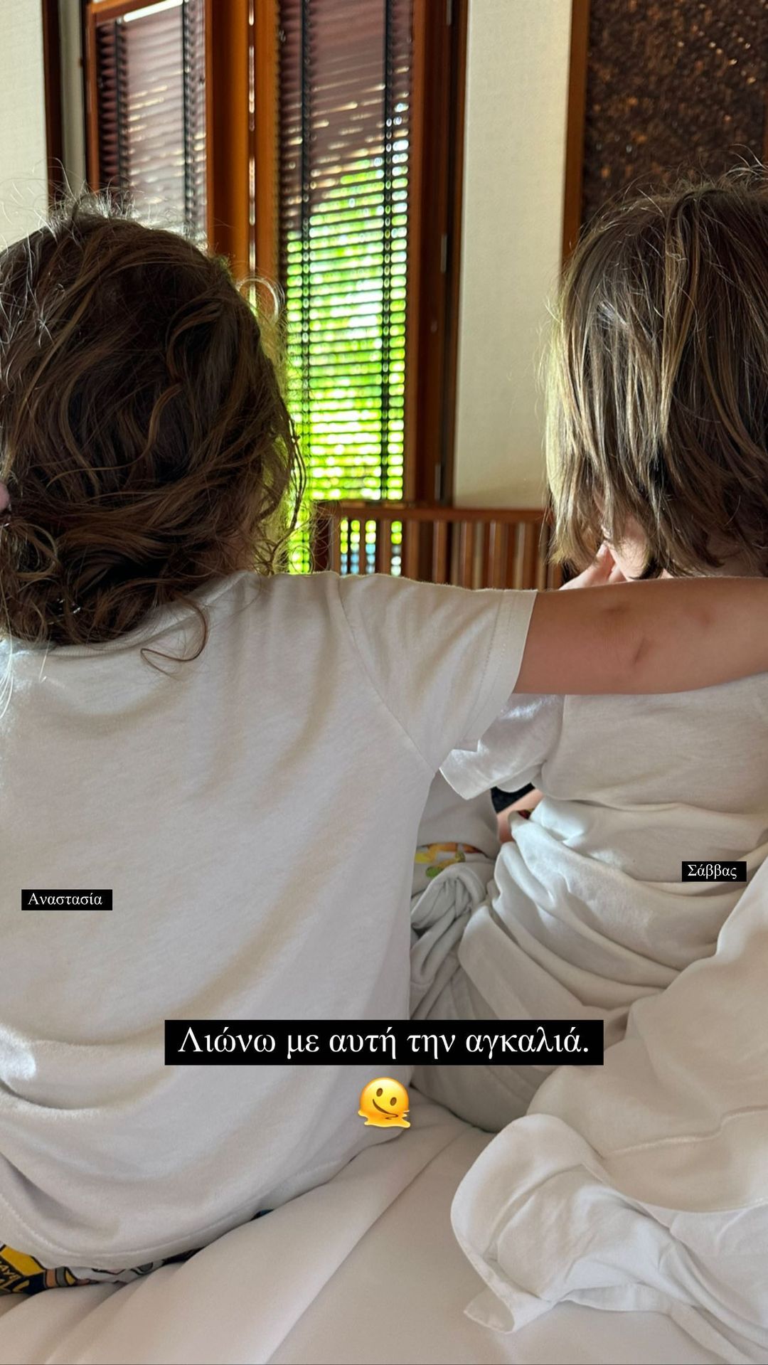 Η ίδια δημοσίευσε το απόγευμα της Τετάρτης μια φωτογραφία στα stories του Instagram με τα δυο της παιδιά αγκαλιά. Τη συνόδευσε με το μήνυμα: «Λιώνω με αυτή την αγκαλιά».