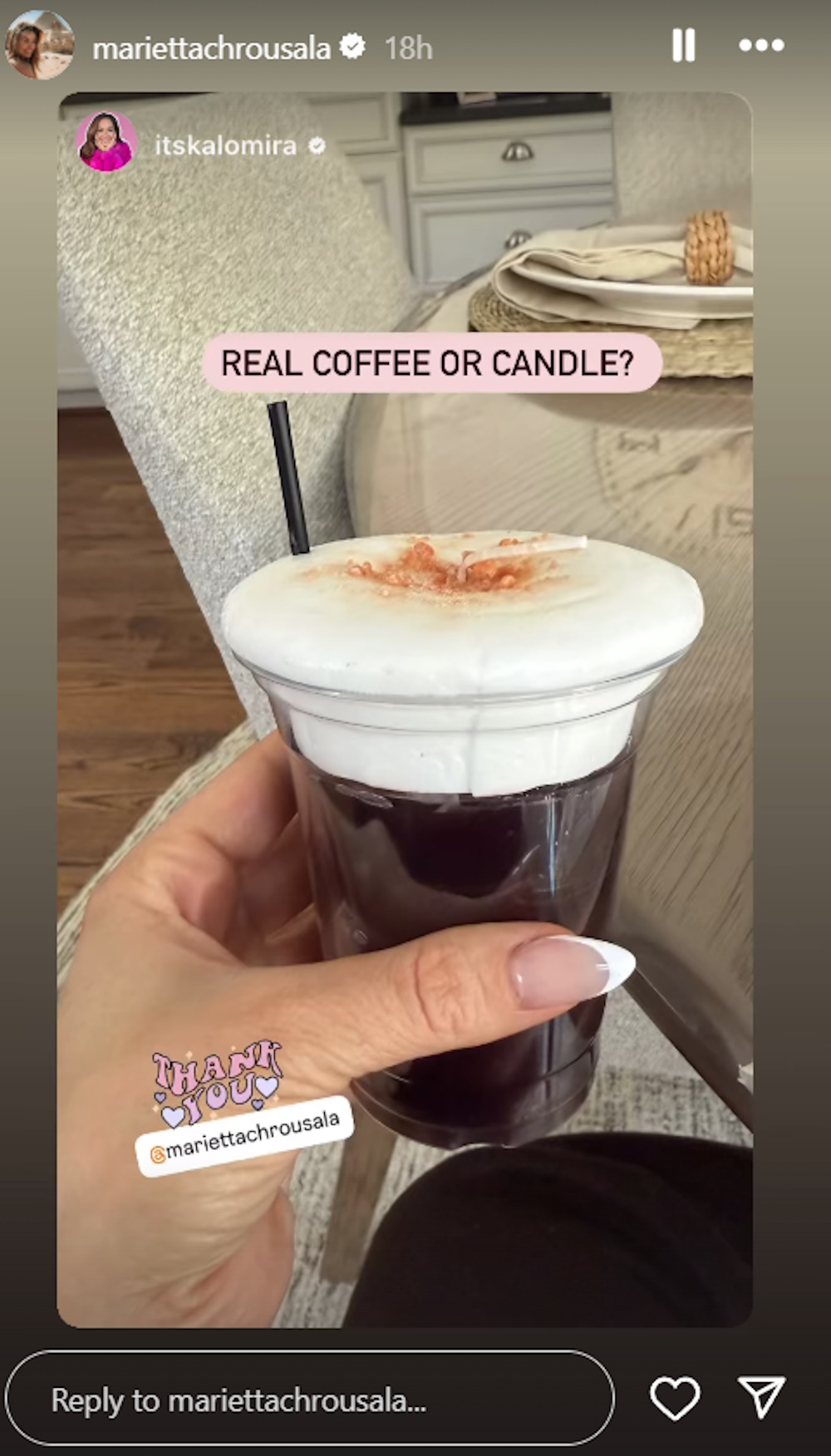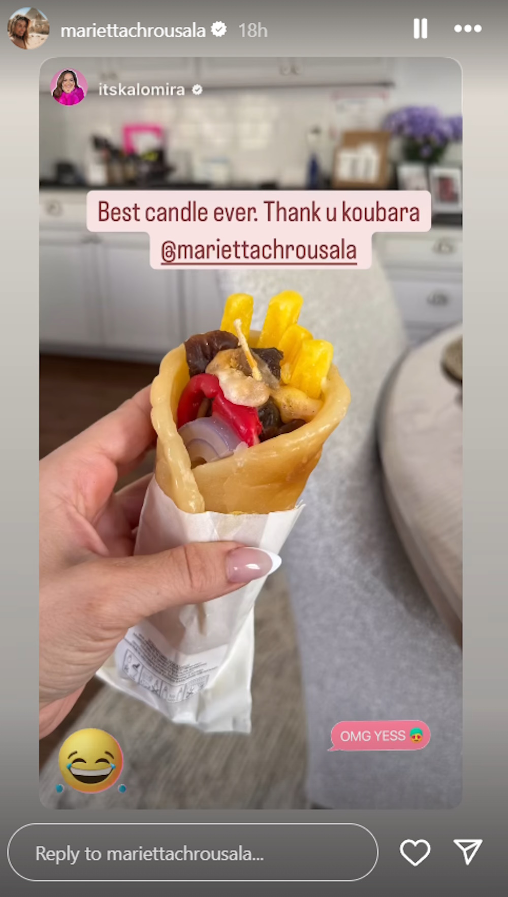 Συγκεκριμένα, η μια λαμπάδα ήταν freddo cappucino και η άλλη ήταν ένα τυλιχτό σουβλάκι! Όπως ήταν φυσικό, η Καλομοίρα ενθουσιάστηκε με τις λαμπάδες καθώς λατρεύει την Ελλάδα αλλά και γιατί θα εντυπωσιάσει στην εκκλησία την ημέρα της Ανάστασης.