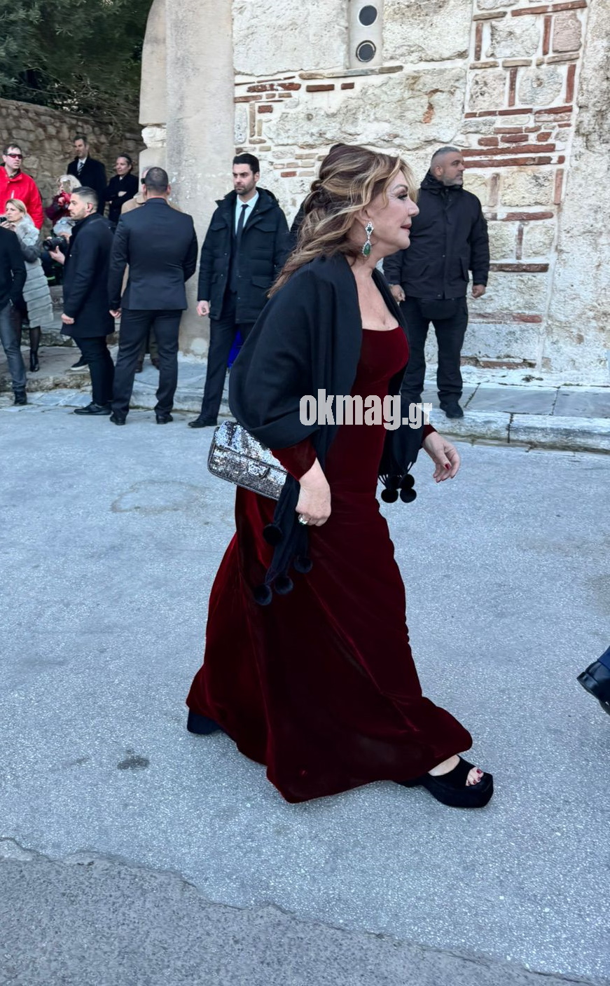 Η Αγάπη Πολίτη έφθασε στην εκκλησία με burgundy velvet τουαλέτα, μαύρη πασμίνα και μαύρα πέδιλα ενώ ολοκλήρωσε το look της με ασημί τσάντα και σμαραγδένια μακριά σκουλαρίκια.