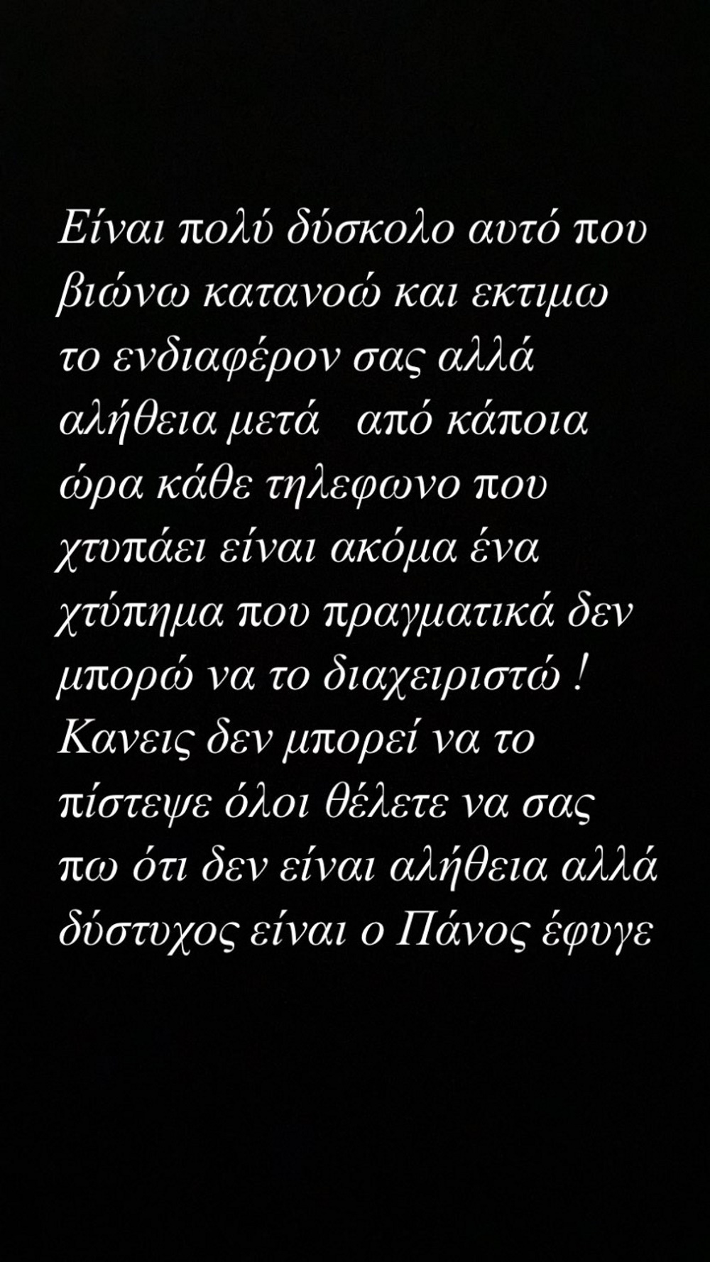 «Μου την είχες στείλει πριν 3 μέρες, μιλήσαμε και μου είπες πάντα έτσι πρέπει να είμαστε!! Με αποκαλούσες αγάπη μου και σε πολλούς ξένιζε και όταν σε ρωτούσαν γιατί αναφερόσουν σε εμένα με αυτή την λέξη, πάντα έπαιρνες την θεατρική σου παύση, όπως έλεγες, και τους απαντούσες: «γιατί πολύ απλά τον αγαπώ!»