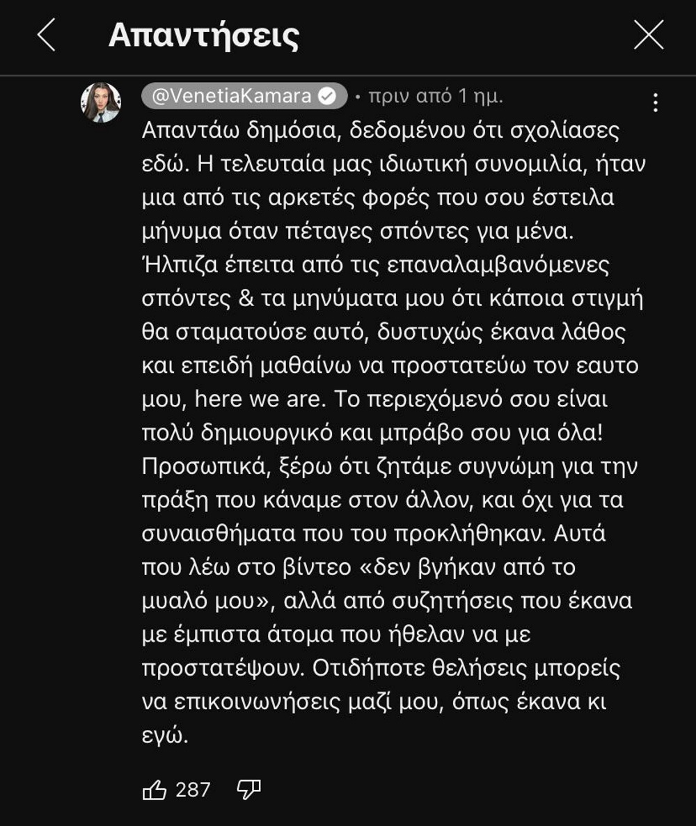 Και μιας και αναφέραμε τον Κωνσταντίνο Βασάλο, τη Βενετία Καμάρα τη γνωρίζετε; Η Βενετία είναι μια πολύ δημοφιλής youtuber, πρώην κολλητή μετον νυν κολλητό του τον Φίπστερ, αλλά τώρα πια δεν είναι. Πριν από λίγες μέρες μάλιστα συνέβη αυτό που ακολουθεί μετά το unfollow που του είχε κάνει εκείνη και διάφορα σχόλια όπου, προφανώς, φωτογράφιζε ο ένας τον άλλον χωρίς ονόματα:
