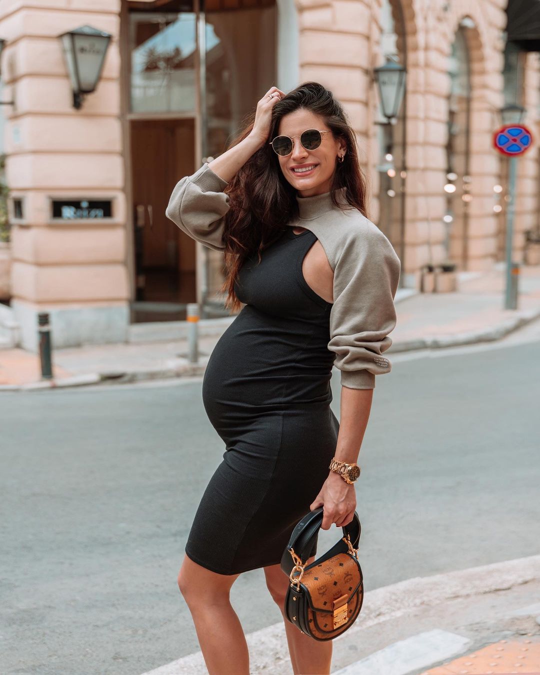 Από τις πιο classic και διαχρονικές επιλογές και στην εγκυμοσύνη είναι το απόλυτο μαύρο. Η Χριστίνα το συνδυάζει με ένα ιδιαίτερο top- μπολερό με sexy ανοίγματα που δίνουν ένα παιχνιδιάρικο εφέ στο look της. Μπορείς να το υιοθετήσεις κι εσύ και το βράδυ για μια βόλτα στην πόλη.