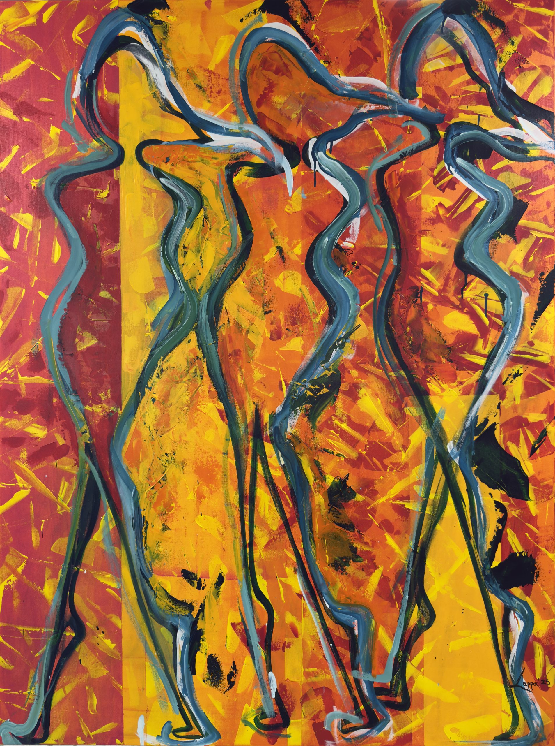 Με ζωηρή χρωματική παλέτα και ελεύθερη, εκρηκτική γραφή, οι επιμήκεις ανθρώπινες μορφές μοιάζουν να κινούνται στον ίδιο ρυθμό, μέσα σε ένα περιβάλλον έντασης και μεταμόρφωσης. Οι φιγούρες δεν παραπέμπουν σε συγκεκριμένες ταυτότητες· λειτουργούν συμβολικά, ως φορείς της ανθρώπινης ύπαρξης, της αντοχής και της διαρκούς κίνησης της ζωής.