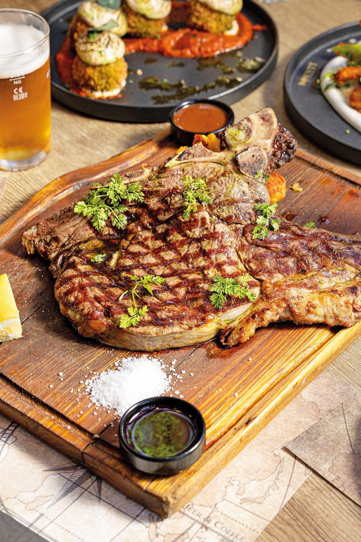 Ο σεφ Γιώργος Νησίριος, που έχει επιμεληθεί με αγνές πρώτες ύλες το μενού, έχει συμπεριλάβει premium κοπές κρεάτων, προσεγμένες συνταγές στα κάρβουνα, grill, πίτσα με μεγάλες μερίδες, μακαρονάδες, μίνι μπέργκερ και μοναδικές γεύσεις με ποιότητα και μεράκι μαγειρεμένες.