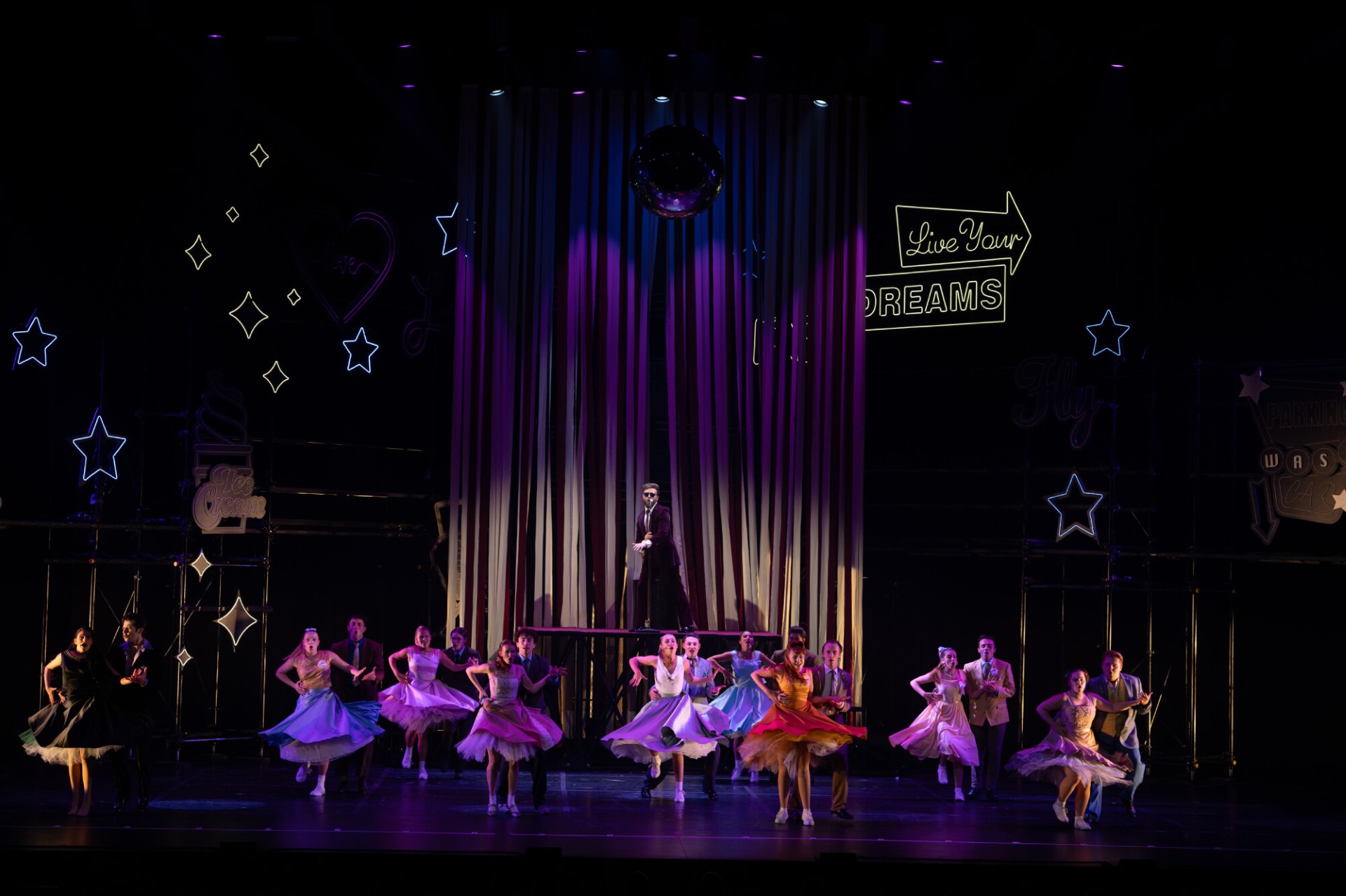 Η παράσταση, φέρνει το πνεύμα του Rydell High στη σκηνή με φαντασμαγορικά κοστούμια, ανατρεπτικό χιούμορ και ασταμάτητη ενέργεια.