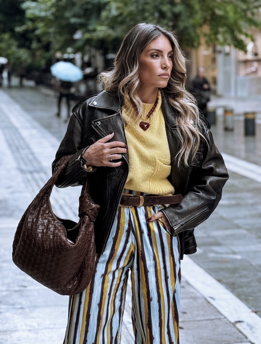 Το ίδιο ισχύει και για το outfit της Αθηνάς Οικονομάκου, το οποίο είναι ισορροπημένο, με το φαρδύ πλεκτό yellow butter sweater που συνδυασμένο με το ρευστό χρωματιστό παντελόνι δημιουργεί μια αίσθηση χαράς και εξωστρέφειας.