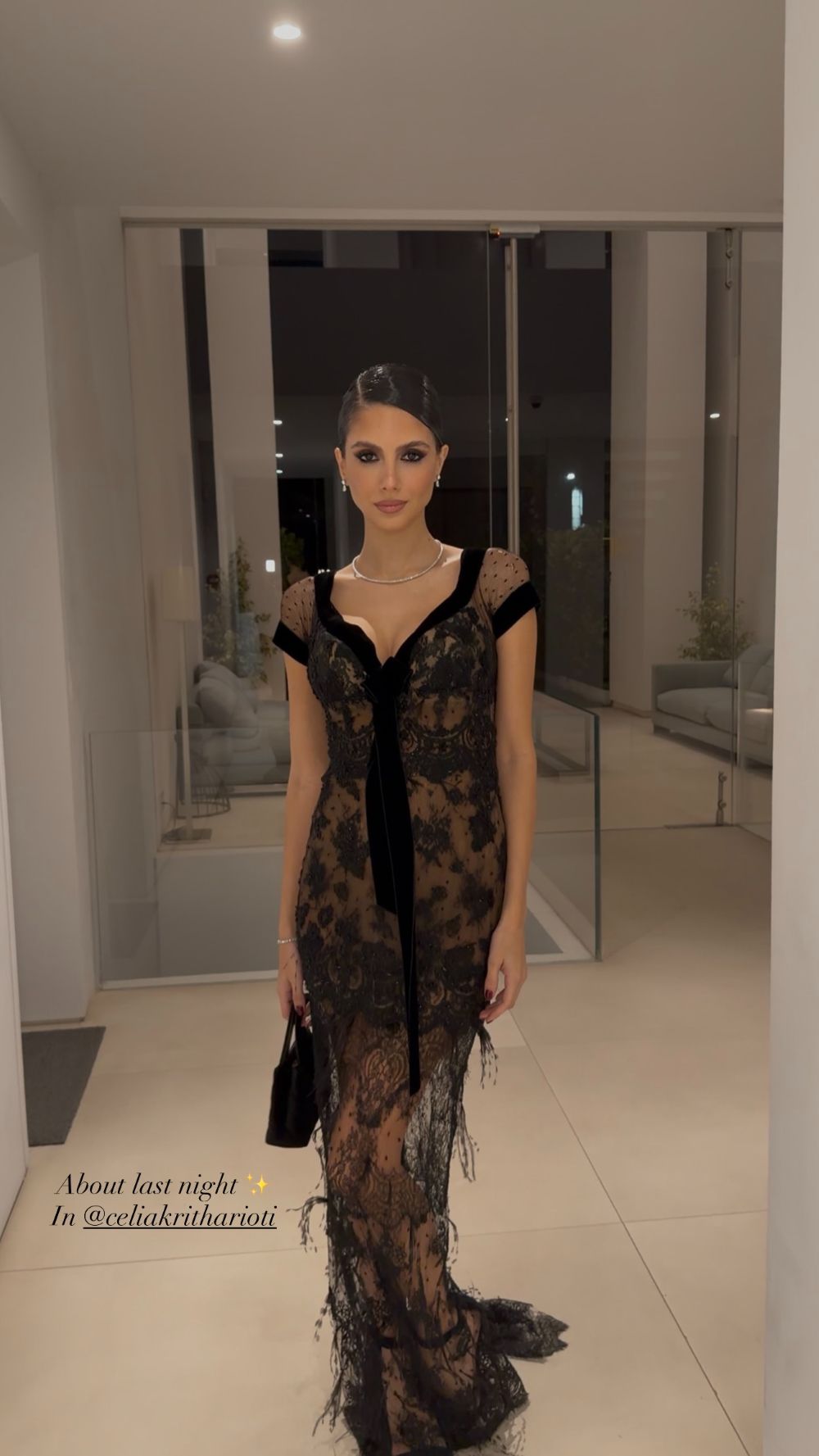Το σχέδιο αγκαλιάζει τη σιλουέτα, με κοντά μανίκια από διαφάνεια και λεπτομέρειες από βελούδο που τονίζουν τη γραμμή του φορέματος. Το look ολοκληρώθηκε με sleek χτένισμα, έντονο eye makeup και διακριτικά κοσμήματα, επιλογές που ανέδειξαν το φόρεμα.