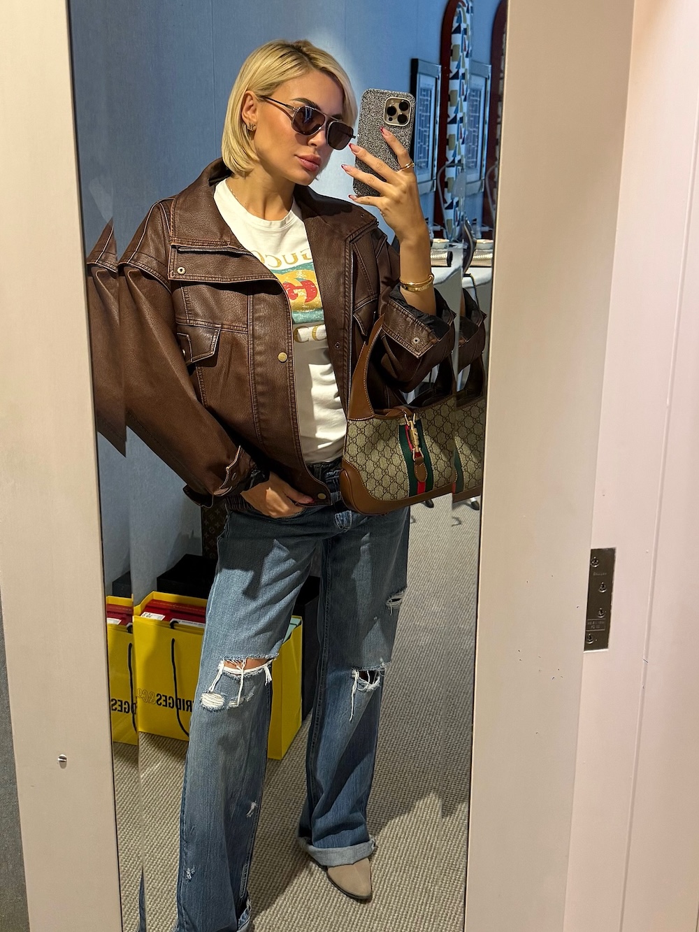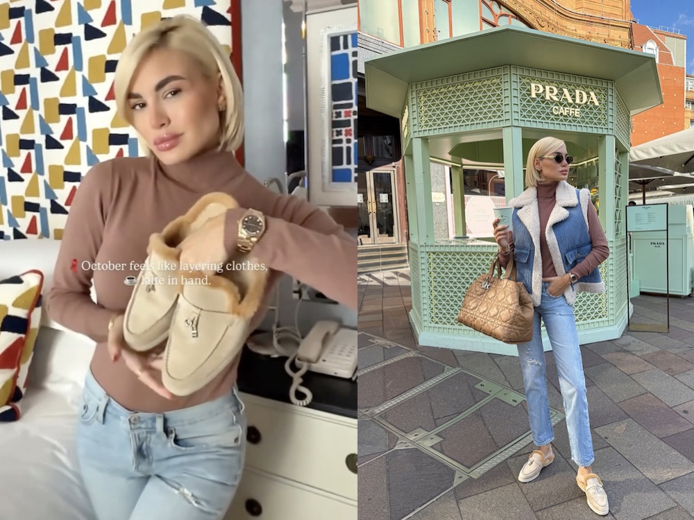 Η Αλεξάνδρα Παναγιώταρου, μέσα από τις πρόσφατες εμφανίσεις της, μετατρέπει αυτή την εποχή σε αφήγηση. Από τη Μύκονο, όπου φόρεσε το σετ Loewe με το χαρακτηριστικό δερμάτινο patch, μέχρι το Λονδίνο, όπου φωτογραφήθηκε μπροστά στο Prada Caffè με Levi’s jean, shearling γιλέκο και loafers, συνθέτει ένα ύφος που ενώνει τις εποχές με φυσικότητα και συνέπεια. Το Αλεξάνδρα Παναγιώταρου denim style δεν είναι απλώς επιλογή. Είναι μέθοδος ζωής.