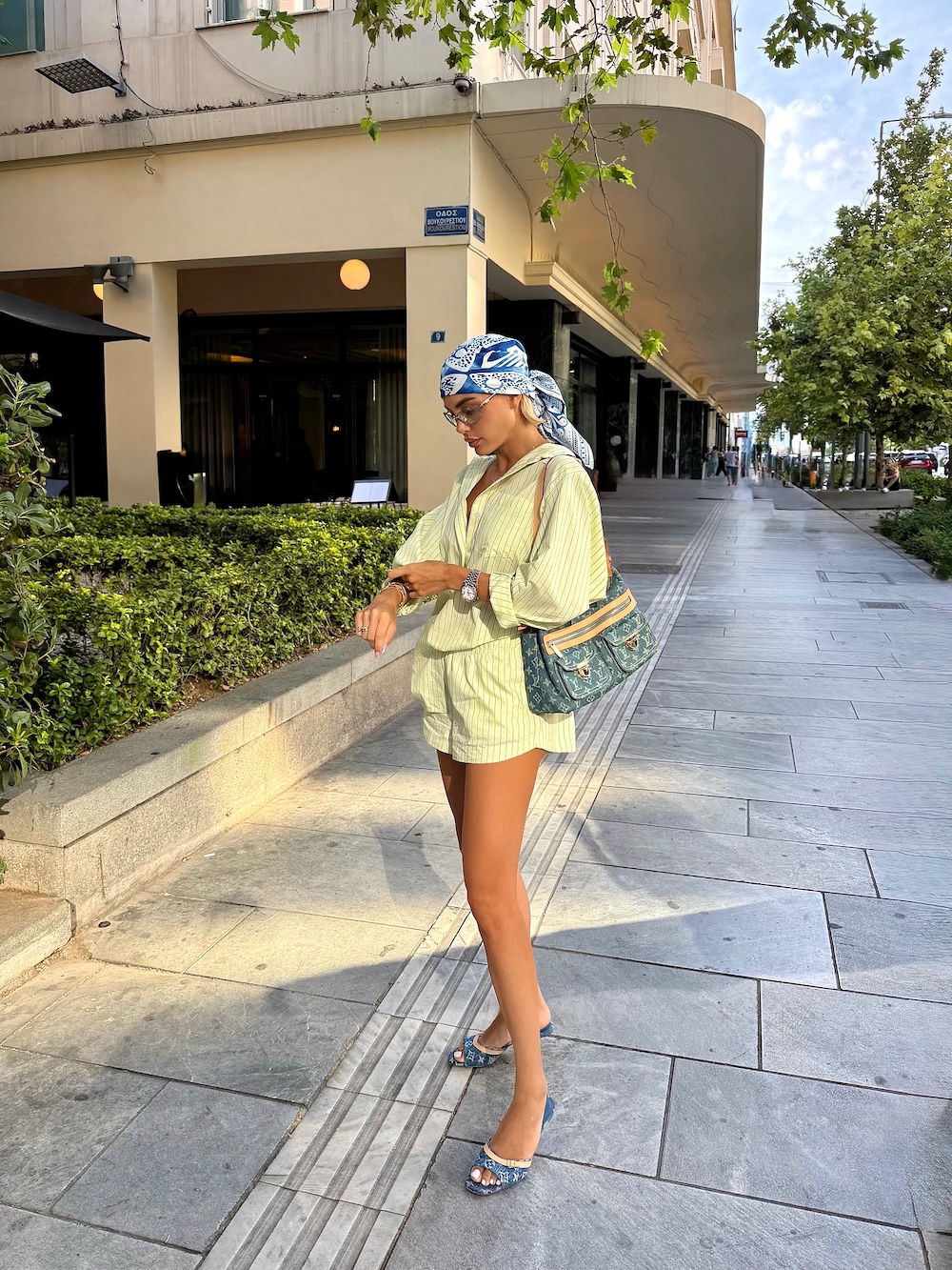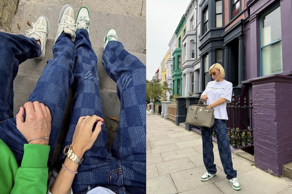 Στο Notting Hill, το denim εμφανίζεται σε patchwork εκδοχή με sneakers και oversized T-shirt, κρατώντας μια Hermès Birkin σε γκρι τόνο — ένα παιχνίδι ανάμεσα στο street και το luxury. Στην Αθήνα, η τσάντα Louis Vuitton από jean καμβά συνοδεύει ένα σύνολο σε pastel αποχρώσεις, επιβεβαιώνοντας πως το ύφασμα αυτό μπορεί να γίνει κομμάτι κάθε πόλης, κάθε εποχής, κάθε διάθεσης.