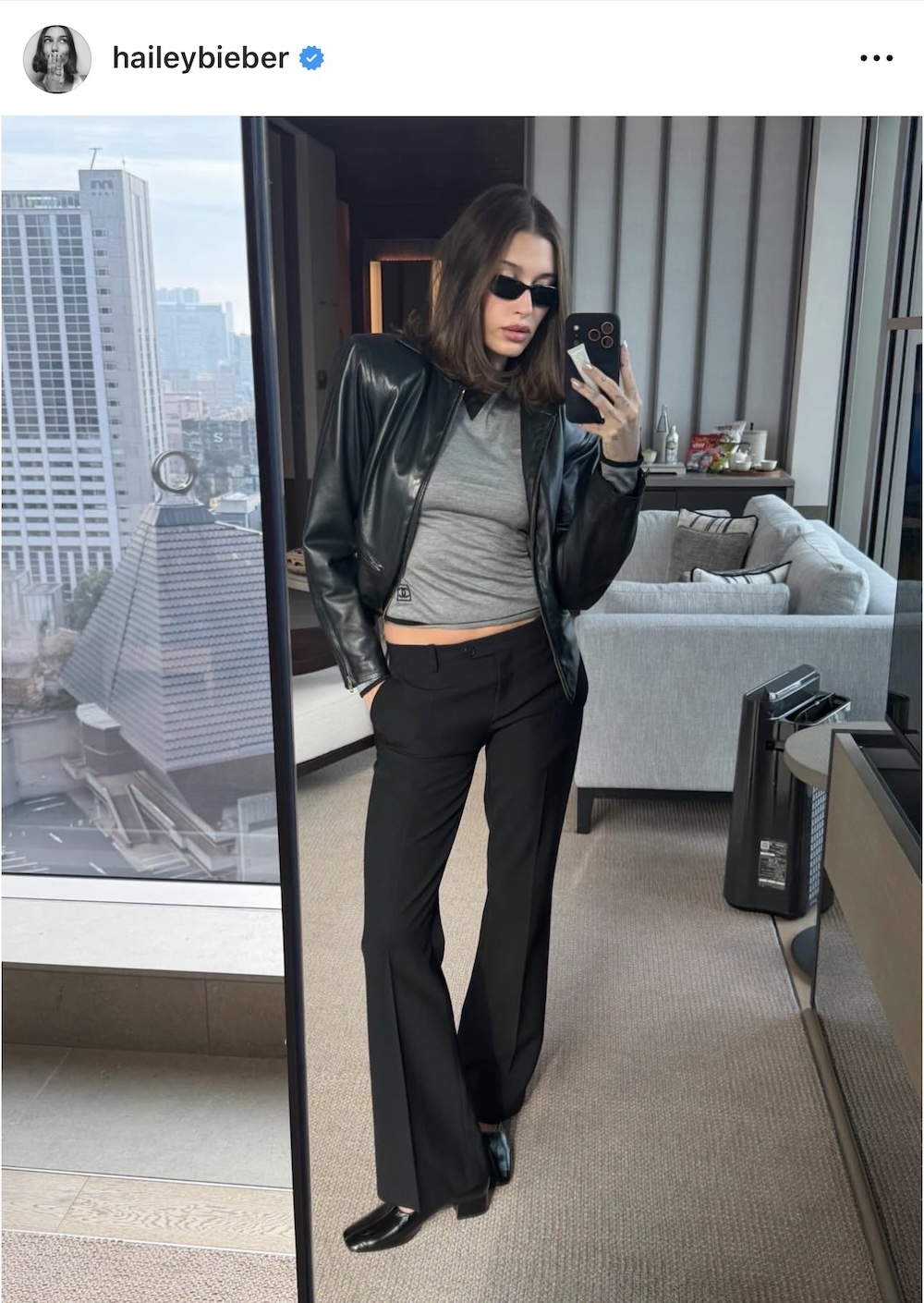 Ένα πολύ μαλακό, σχεδόν buttery, μαύρο δερμάτινο jacket αποτελεί τον ιδανικό σύντροφο για αυτή την περίοδο, μέχρι τις ζεστές ημέρες του καλοκαιριού. Η Χέιλι Μπίμπερ το συνδύασε με ένα grey melange t shirt και ένα μαύρο υφασμάτινο παντελόνι με ανοιχτή κατάληξη τύπου flair, αναβαθμισμένο σύμφωνα με τις σύγχρονες τάσεις.