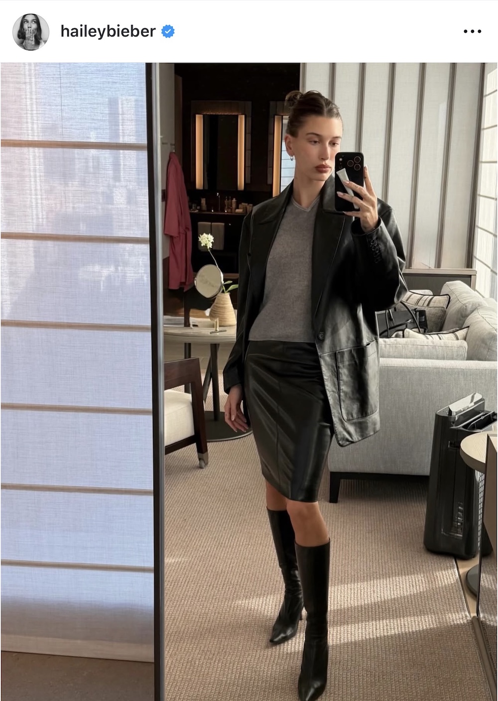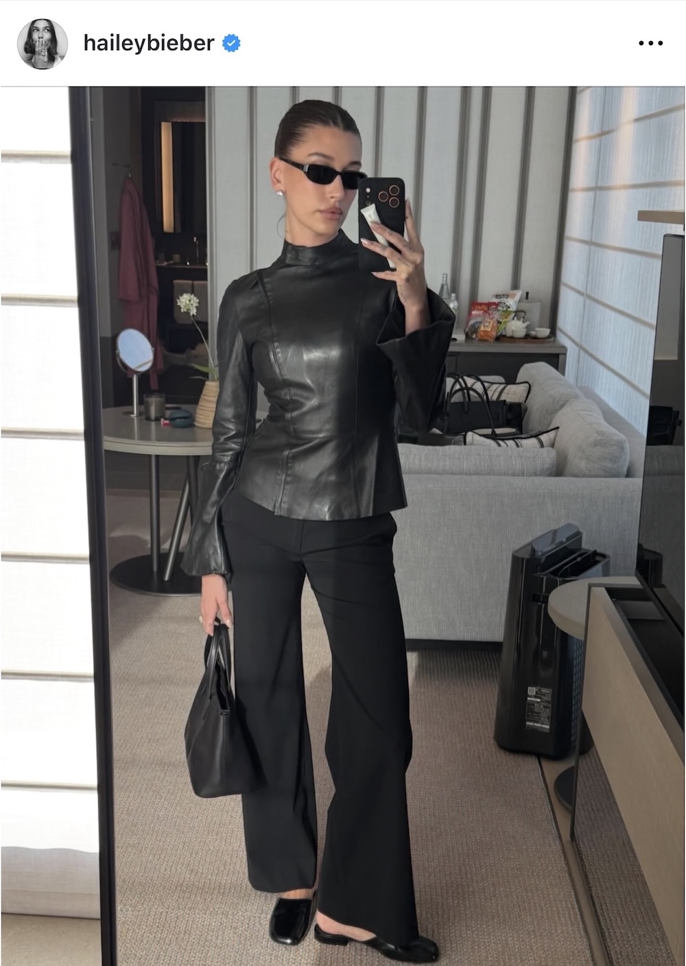 Με το ίδιο παντελόνι και την ίδια αισθητική, η Χέιλι Μπίμπερ πρότεινε μια παραλλαγή, φορώντας ένα breathtaking και jaw dropping μακρυμάνικο δερμάτινο top. Το αυστηρό αυτό κομμάτι δεν αφήνει να φανεί ίχνος δέρματος, διαθέτει μακριά μανίκια και ανεβασμένο neck line που καλύπτει τον λαιμό.