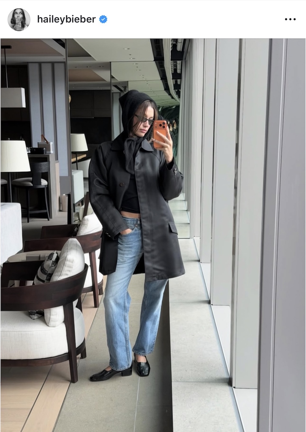 Ωστόσο, η Χέιλι Μπίμπερ ανέβασε το look, φορώντας ένα square knit scarf σαν head piece, δίνοντας στο outfit κάτι από την προσωπικότητά της και τον μοναδικό τρόπο να το υποστηρίζει. Επέλεξε επίσης παπούτσια ιδιαίτερης αλλά σύγχρονης αισθητικής, που αποτελούν mega trendy choice πολλών celebrities.