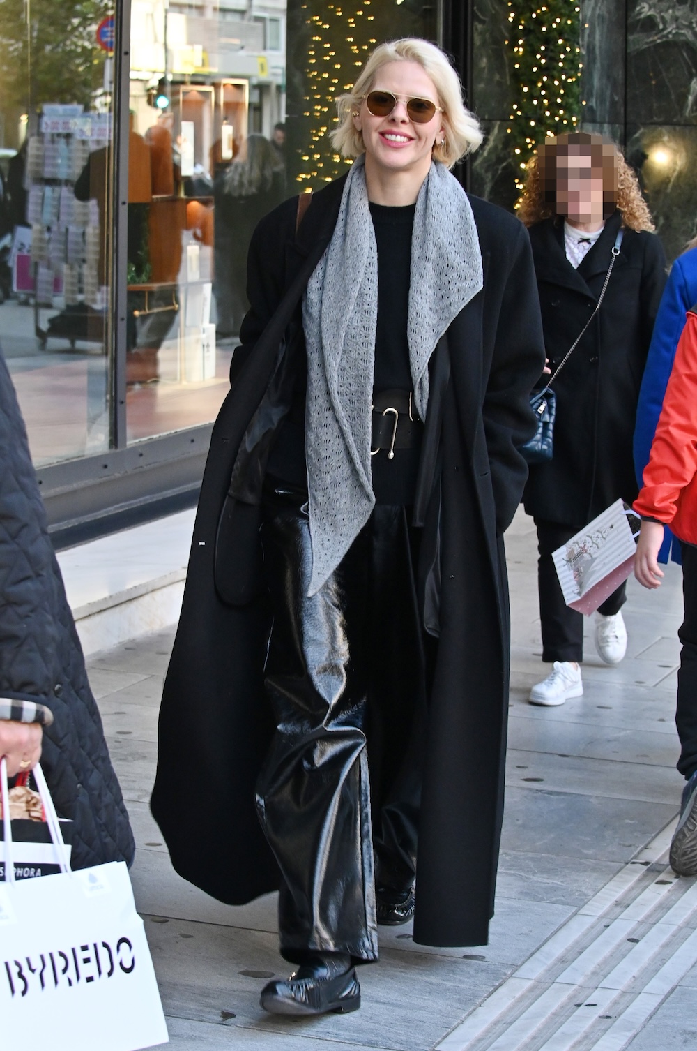 Σε ένα outfit με μαύρη μπλούζα, μαύρο παλτό, γυαλιστερό παντελόνι σε μαύρο χρώμα, μαύρη ζώνη με περίτεχνο σχέδιο και μαύρα γυαλιστερά loafers, έκανε τη διαφορά με μία γκρι πινελιά, με ένα μακρύ κασκόλ.