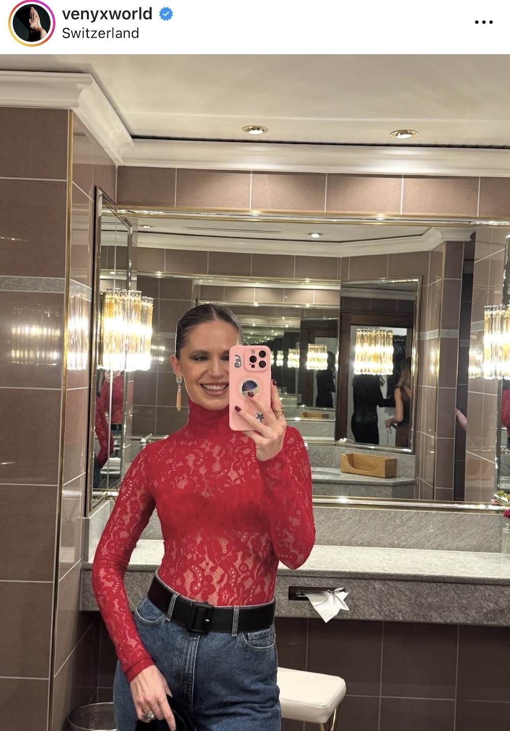 Το κόκκινο διάφανο δαντελένιο τοπ, το οποίο φόρεσε από μέσα με ένα κόκκινο bras, είχε ψηλό λαιμό και μακριά μανίκια, καλύπτοντας με delicate τρόπο την περιοχή του λαιμού και των χεριών, ενώ το προσάρμοσε μέσα από το παντελόνι της, τονίζοντας με μια έντονη μαύρη ζώνη την περιοχή της μέσης. Το look ολοκληρώθηκε με εντυπωσιακά σκουλαρίκια, μαύρες γόβες με ankle strap, που έδωσαν ισορροπία στο σύνολο.