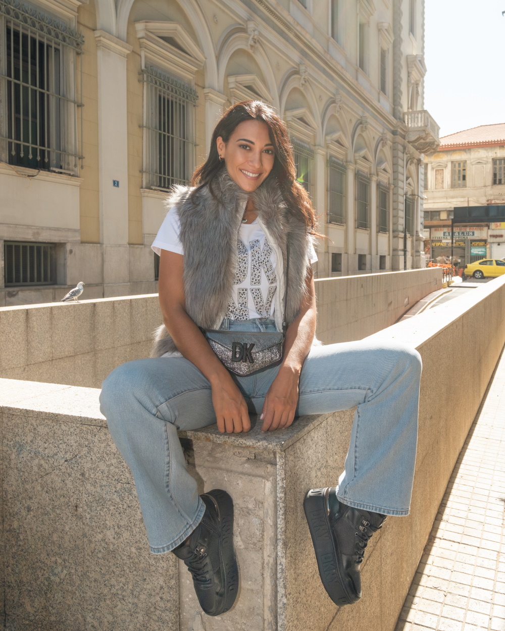 Όσο για τις πιο χαλαρές ημέρες της, όπου η βόλτα της στο κέντρο μπορεί να την οδηγήσει οπουδήποτε, έχει και πάλι το ιδανικό casual DKNY look. Ένα Τ-shirt με το χαρακτηριστικό logo DKNY σε animal print, καθώς και ένα faux fur γιλέκο σε γκρι, συνθέτουν το ιδανικό top combo. Το τζιν που ανοίγει σε καμπάνα συνδυάζεται με ένα μποτάκι με παχιά σόλα και logo DKNY -γιατί οι βόλτες θέλουν άνεση, αλλά θέλουν και φινέτσα. Όσο για την accessory πινελιά, επιλέγει ένα silver τσαντάκι με κούμπωμα-υπογραφή DK
