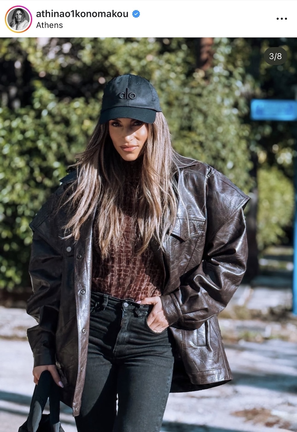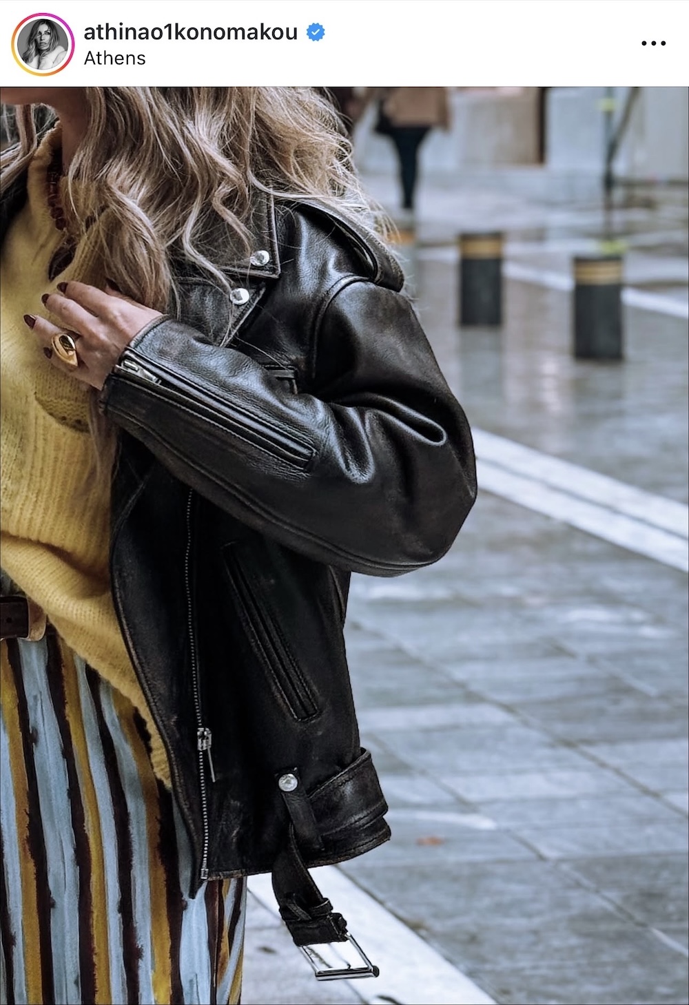 Η Αθηνά Οικονομάκου αγαπά ιδιαίτερα τα τεχνητά δέρματα και κυρίως τα jacket που κατασκευάζονται από αυτό το οικολογικό υλικό. Σε κάθε χρωματισμό, αλλά και σε μαύρο, καθώς και σε oversized γραμμή, τα jacket αυτά μπορούν να φορεθούν όλες τις εποχές, αφού συνδυάζονται εύκολα με όλους τους τύπους ρούχων.