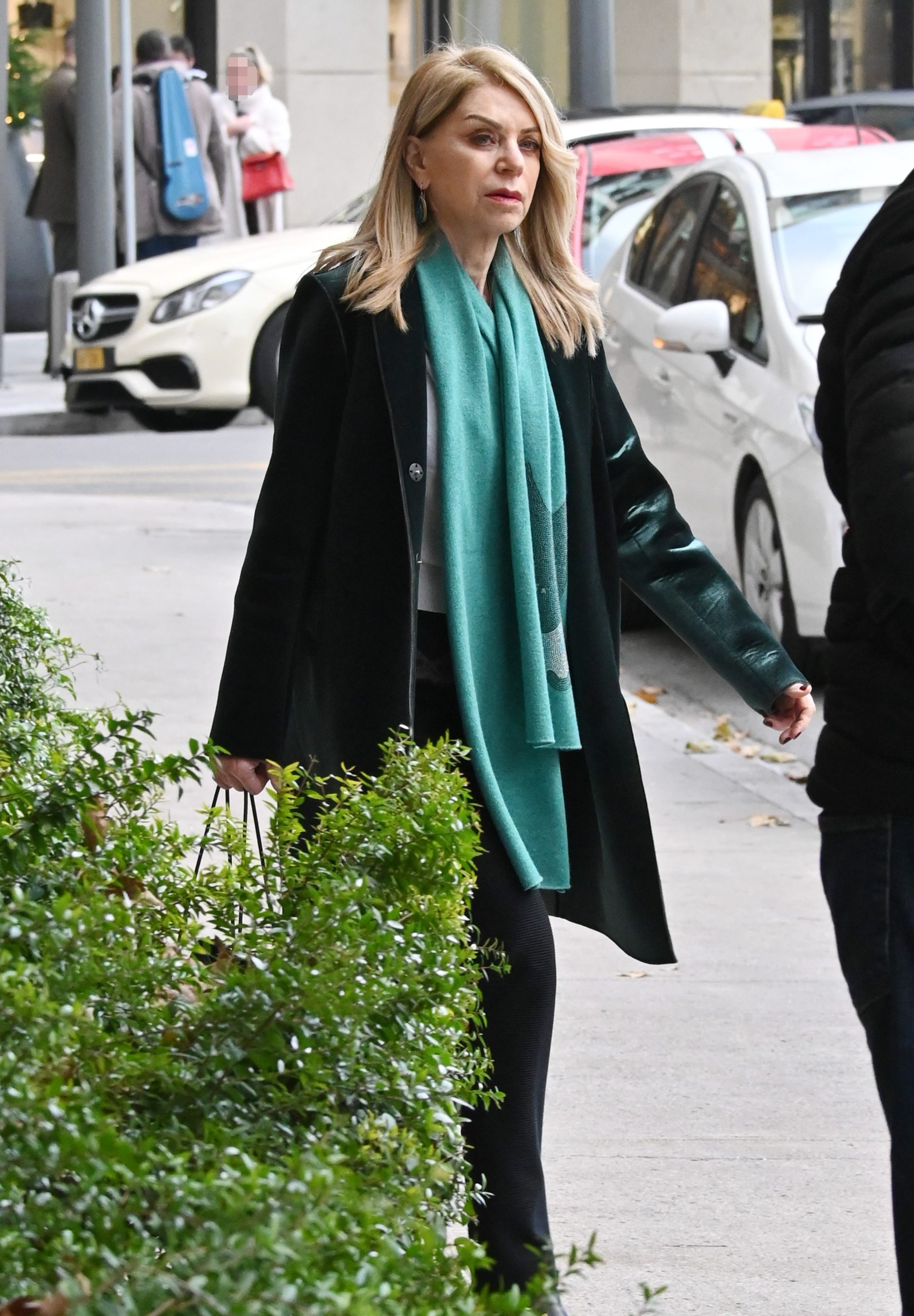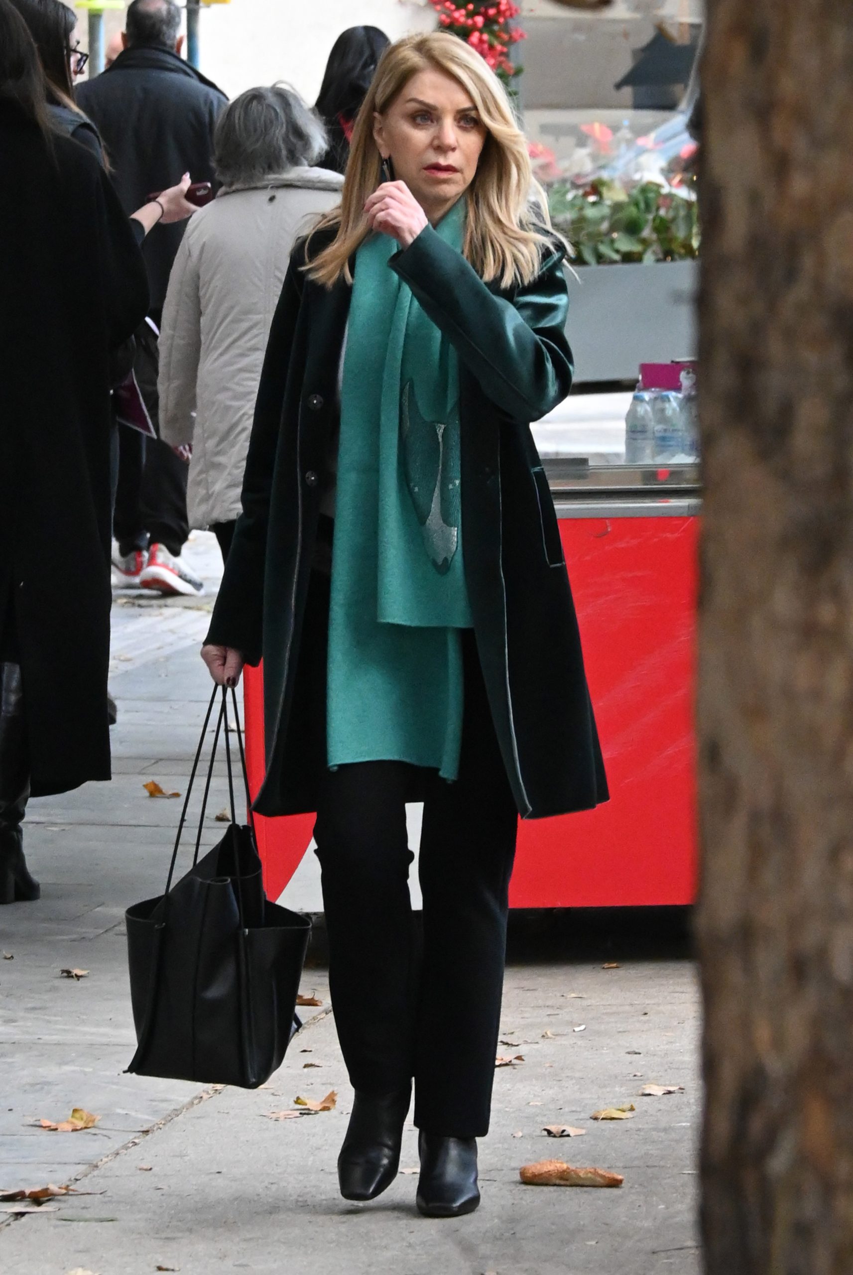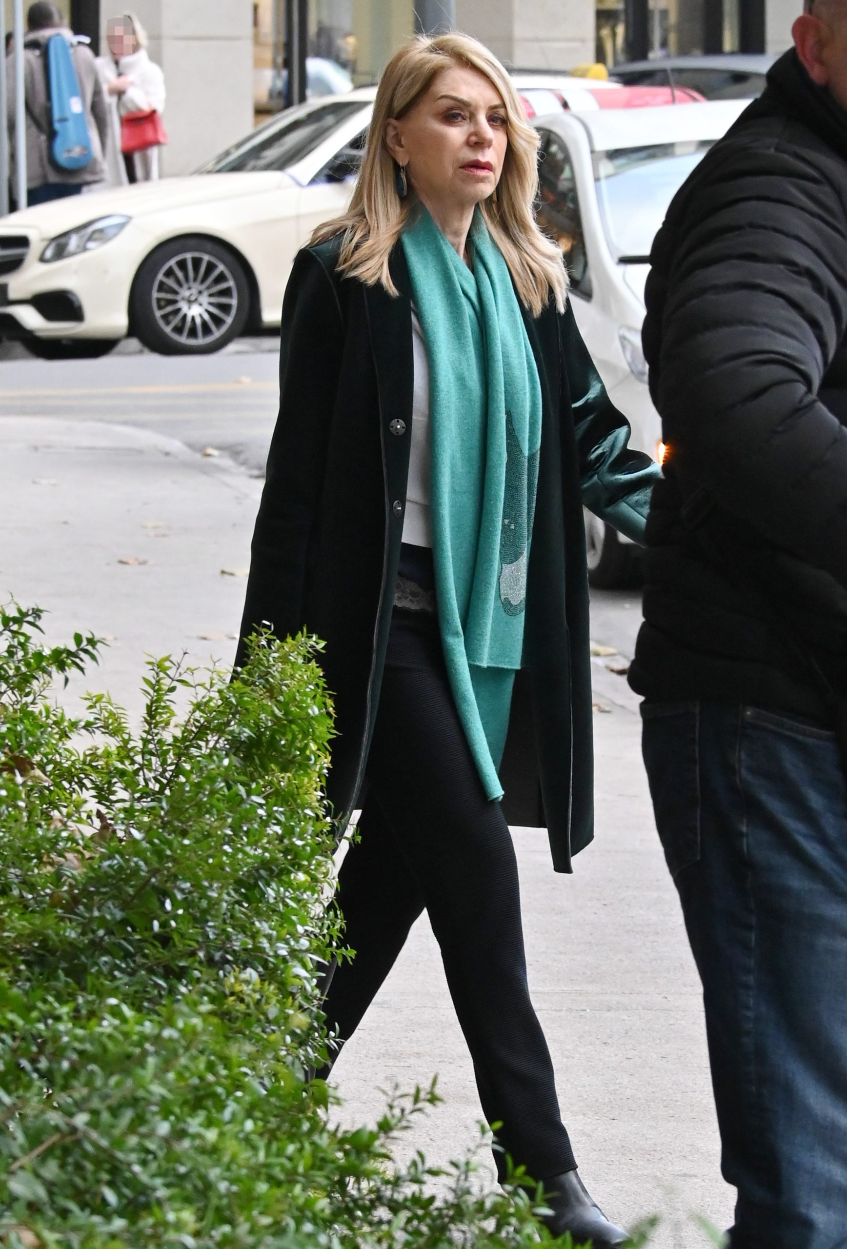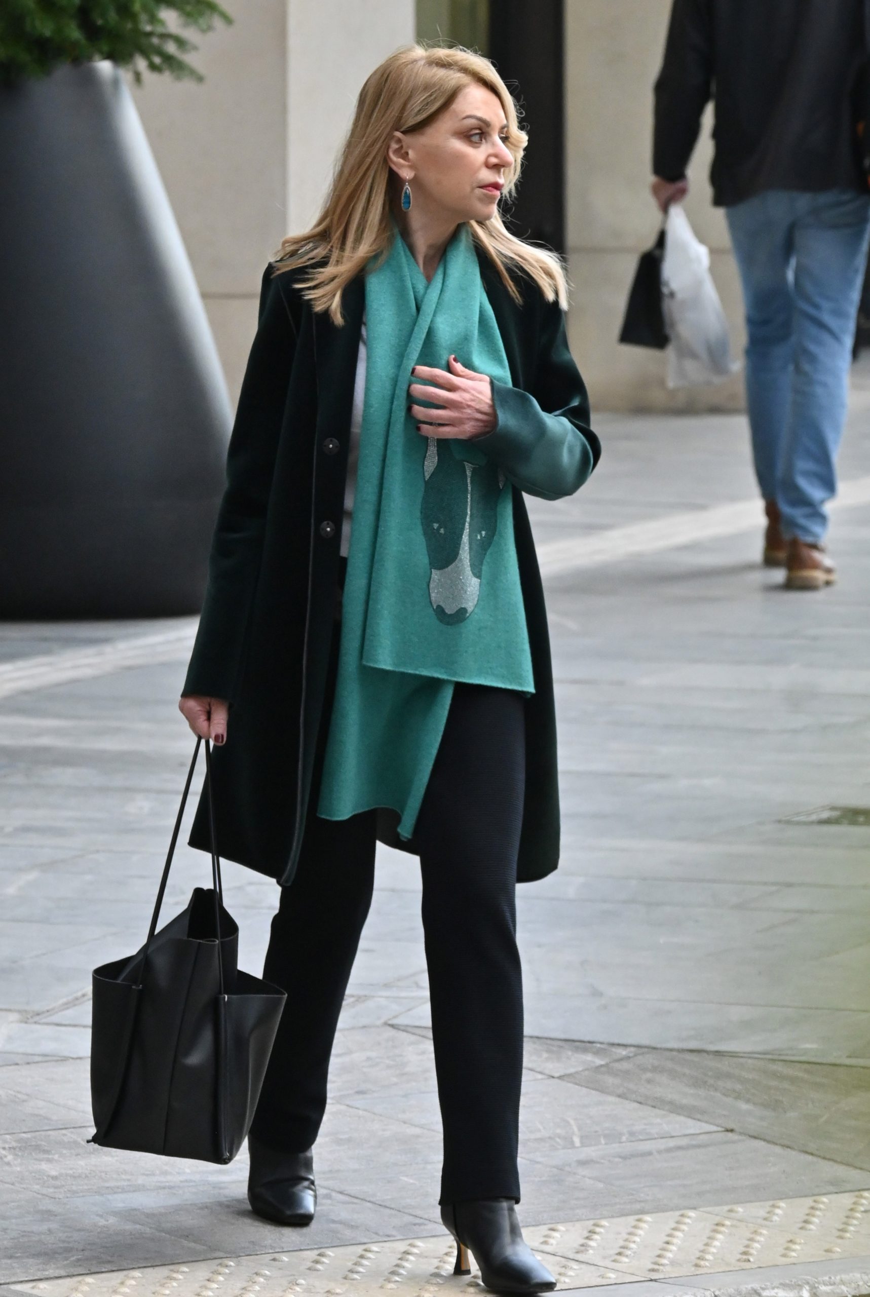 Τη διαφορά έκανε το τιρκουάζ κασκόλ, το οποίο λειτούργησε ως χρωματική πινελιά και έδωσε φρεσκάδα στο look. Η επιλογή του συγκεκριμένου χρώματος, σε αντίθεση με το αυστηρό μαύρο, πρόσθεσε ενδιαφέρον και κίνηση, χωρίς να αλλοιώνει τον σοβαρό και κομψό χαρακτήρα της εμφάνισης. Τα διακριτικά σκουλαρίκια στο ίδιο χρωματικό εύρος ολοκλήρωσαν αρμονικά το styling.
