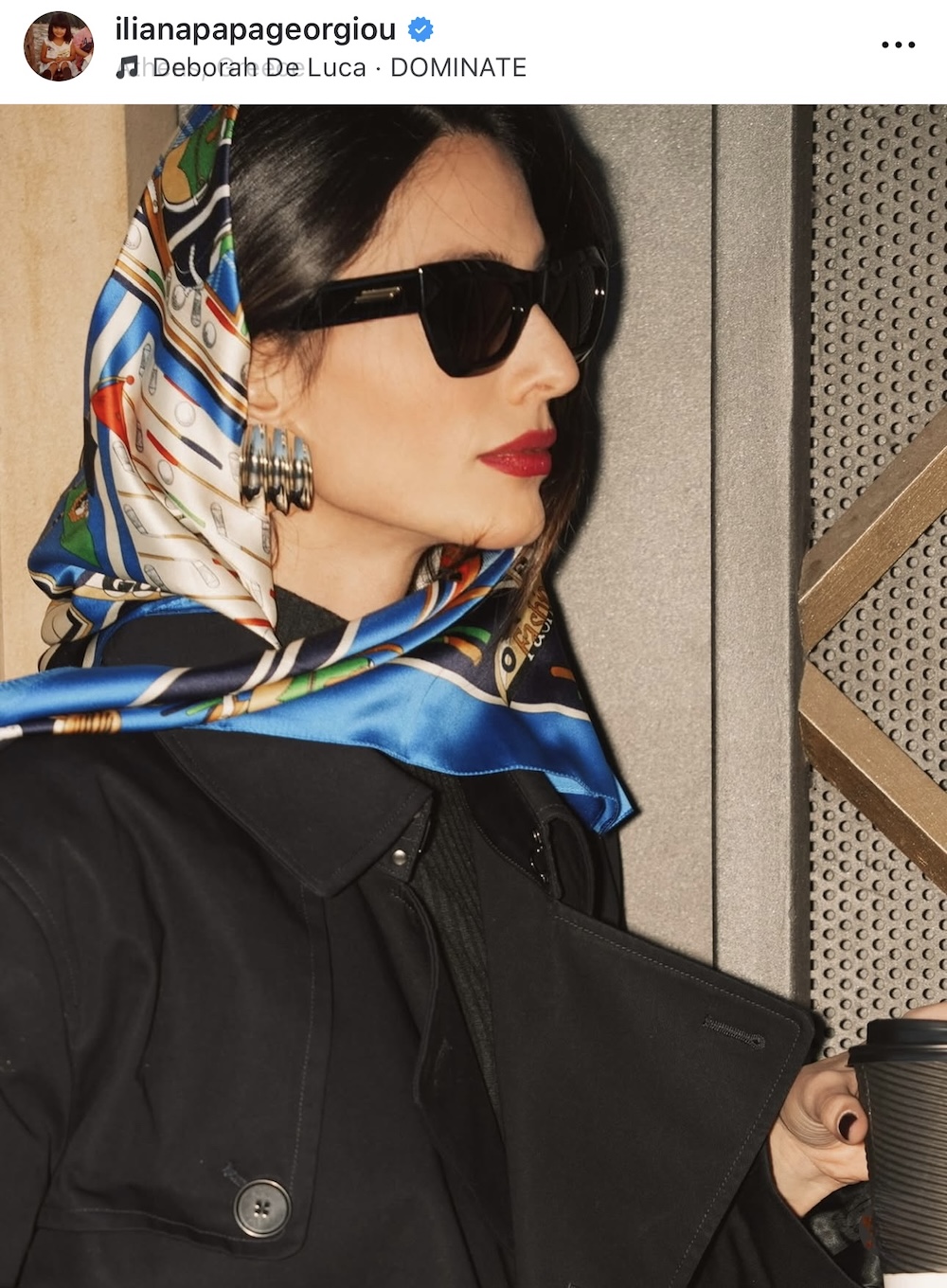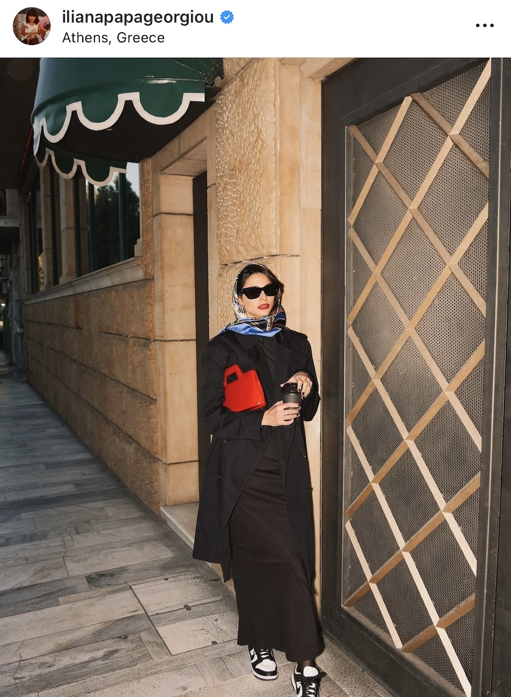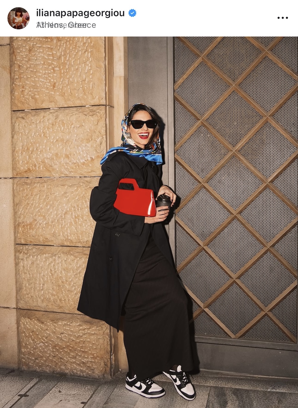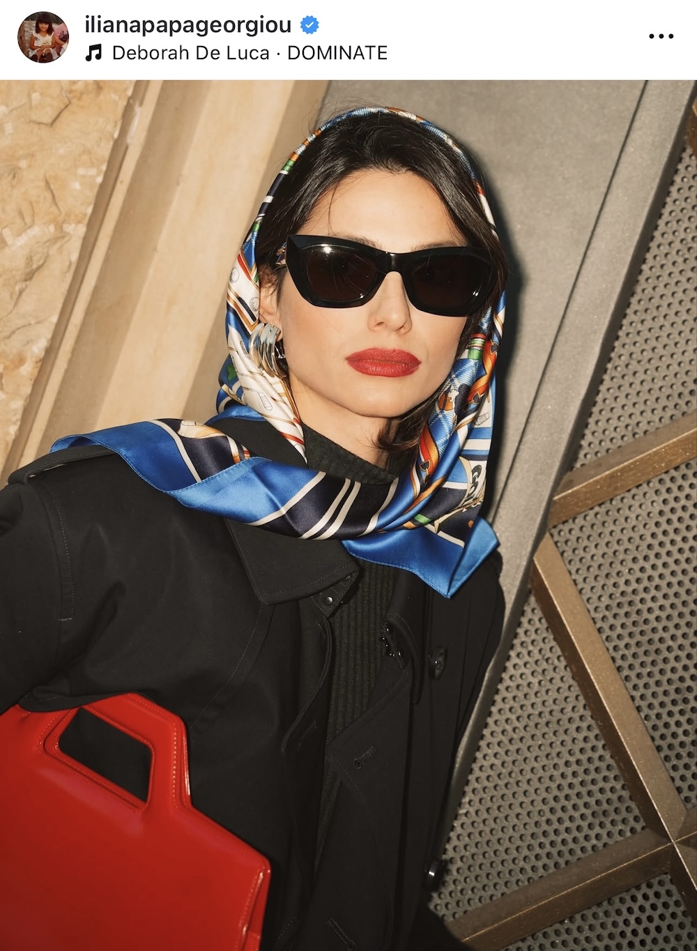 Με μαύρα γυαλιά ηλίου, ένα εντυπωσιακό ζευγάρι μεταλλικά σκουλαρίκια, ένα foulard φορεμένο στο κεφάλι και μια κατακόκκινη τσάντα, η Ηλιάνα Παπαγεωργίου αναβάθμισε ένα basic σύνολο και το μετέτρεψε σε κάτι playful και ζωντανό. Το έντονο lipstick συνδυάστηκε ιδανικά με το funky outfit, το οποίο ειδικά αυτή την pre Christmas περίοδο είναι ιδανικό για βόλτες στην πόλη και catch ups στα city venues. Πρόκειται για ένα όμορφο παράδειγμα του πώς μπορούμε, με απλά στοιχεία αλλά με διάθεση για παιχνίδι, να εξελίξουμε και να διασκεδάσουμε τις εμφανίσεις μας.