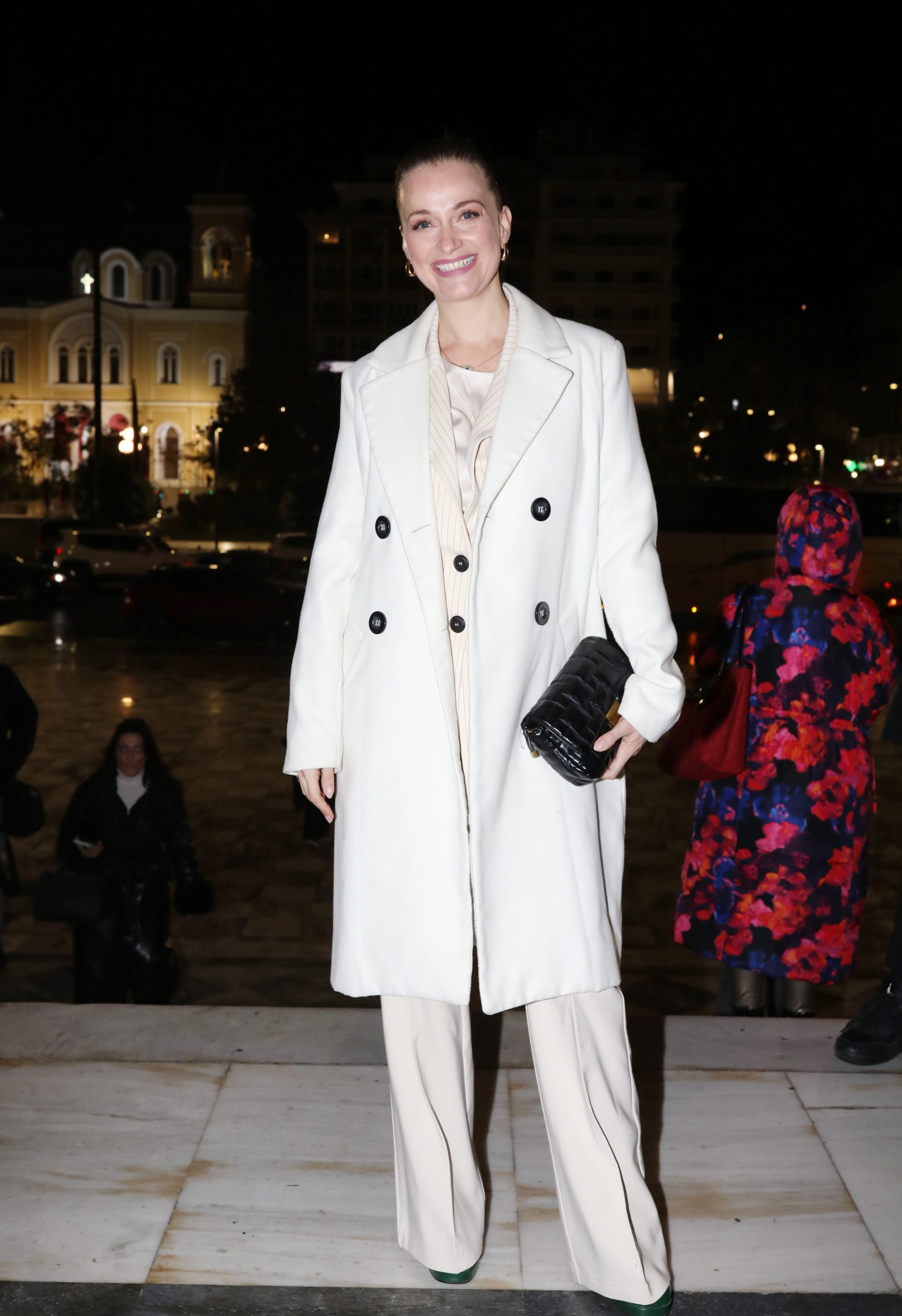 Η ηθοποιός εμφανίστηκε με total ivory σύνολο, ποντάροντας στη δύναμη της μονοχρωμίας. Το tailored παλτό σε καθαρή γραμμή αποτέλεσε τον βασικό άξονα της εμφάνισης, ενώ το εσωτερικό layering σε απαλούς τόνους πρόσθεσε βάθος. Το παντελόνι σε χαλαρή, ίσια γραμμή ολοκλήρωσε το σύνολο με σύγχρονη κομψότητα.