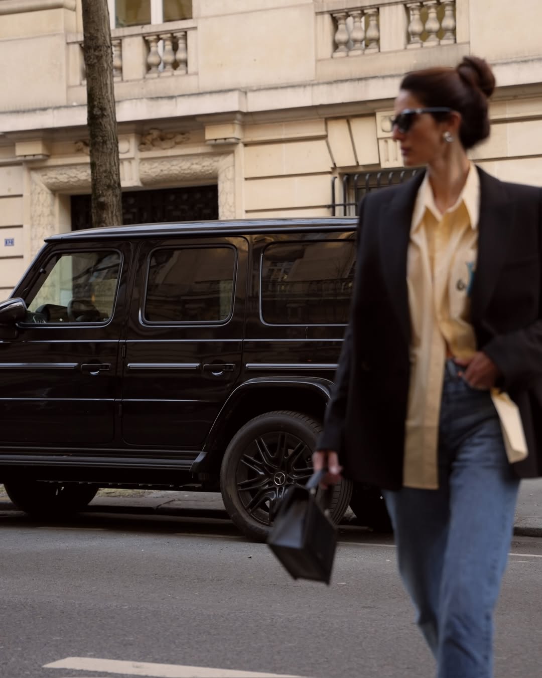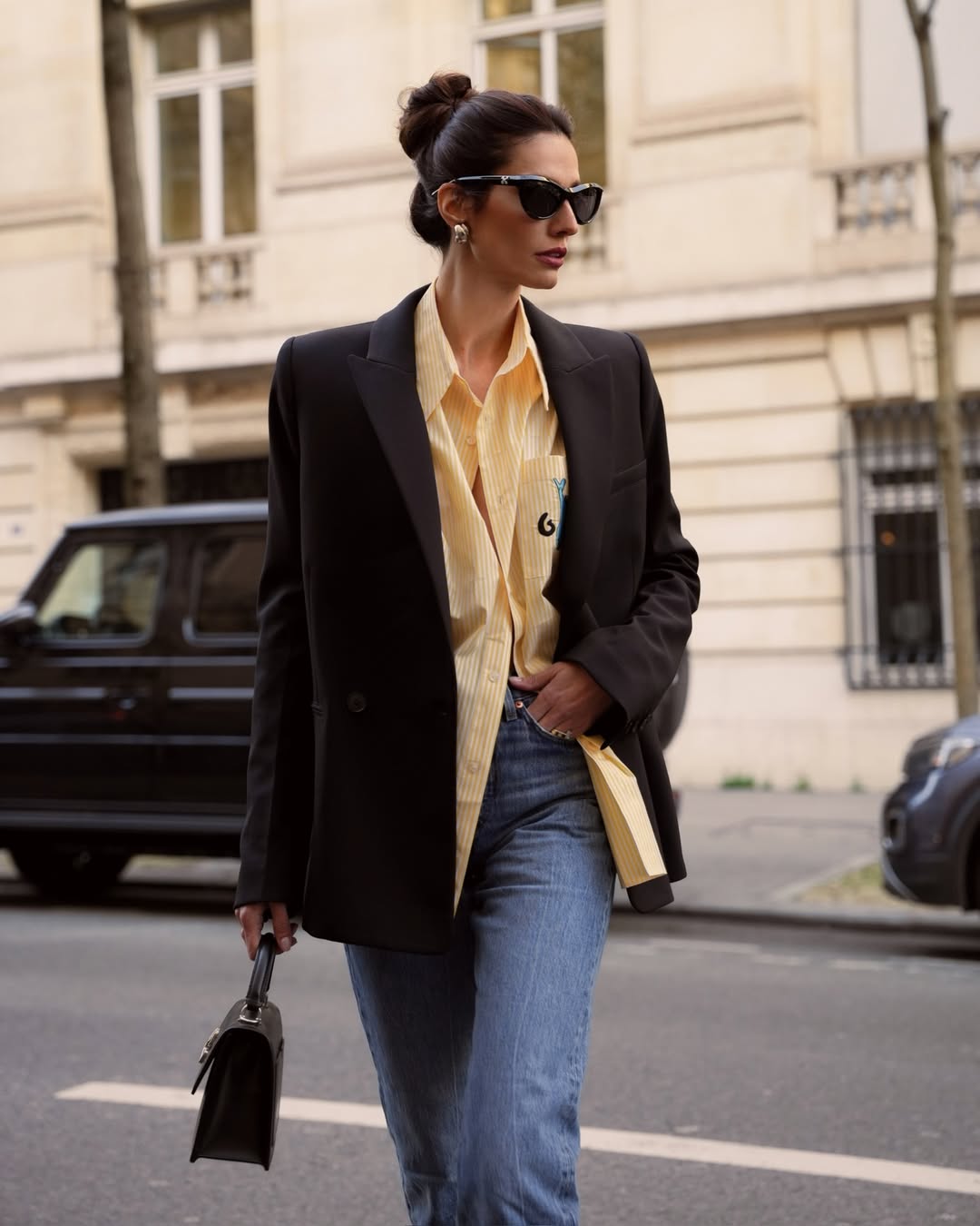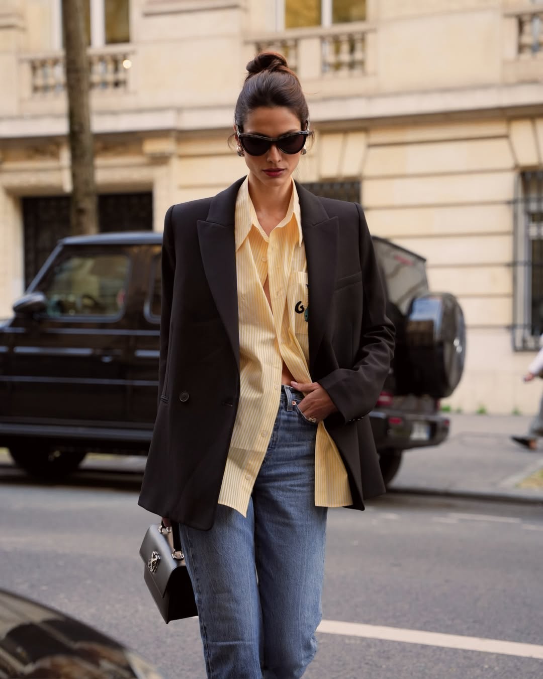 Το styling περιλαμβάνει σκούρο στενό τζιν σε βαθύ denim μπλε, που λειτουργεί ως αντίβαρο στη φωτεινότητα του χρώματος, oversized μαύρο σακάκι που δίνει δομή και ένταση, αλλά και πουκάμισο με χαλαρή γραμμή, χωρίς αυστηρά κουμπώματα, για πιο ανεπιτήδευτο αποτέλεσμα. Τα μαλλιά είναι πιασμένα σε χαμηλό, χαλαρό κότσο, ενώ τα μαύρα γυαλιά ηλίου προσθέτουν τη γνωστή, σικάτη υπογραφή στο σύνολο.