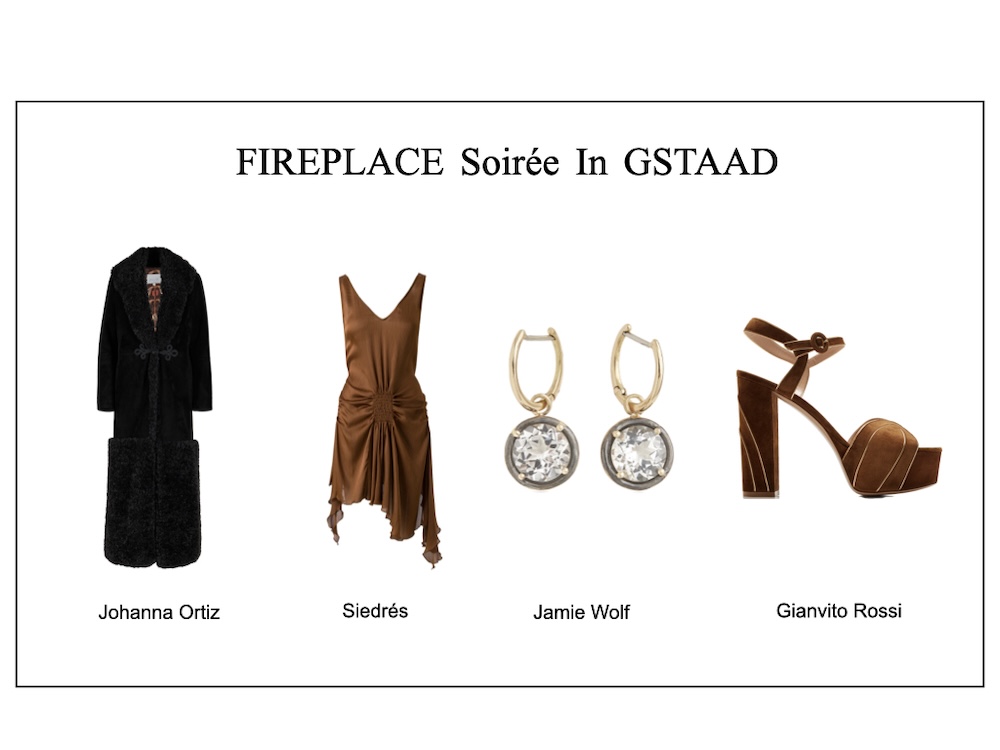 Ένα βράδυ στο βουνό δεν χρειάζεται υπερβολή. Το bronze satin φόρεμα της Siedrés συνδυάζεται με το shearling παλτό της Johanna Ortiz, τα suede platforms της Gianvito Rossi και τα λεπτά σκουλαρίκια της Jamie Wolf. Ζεστά χρώματα, ήσυχες υφές, αίσθηση ιδιωτικής πολυτέλειας.