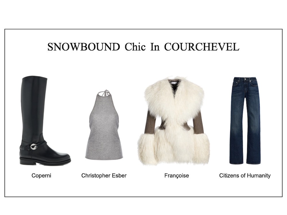 Στο χιόνι, το στυλ απλοποιείται. Το cashmere halter top του Christopher Esber, το shearling jacket της Françoise, τα jeans των Citizens of Humanity και οι μπότες της Coperni δίνουν μια νέα ανάγνωση του après-ski — minimal, πρακτική, αληθινά κομψή.