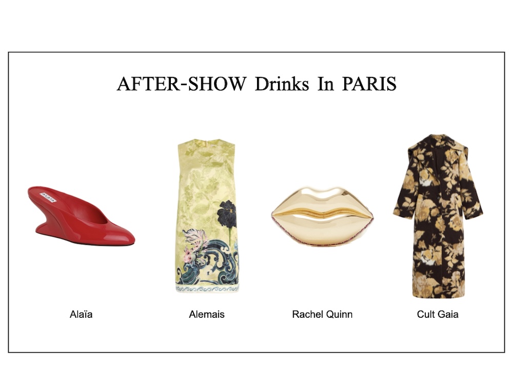 Το Παρίσι μετά την επίδειξη είναι πάντα το ίδιο — μια μικρή γιορτή στα παρασκήνια. Το mini dress της Alemais, το floral coat της Cult Gaia, τα red mules του Alaïa και το gold ring της Rachel Quinn μετατρέπουν τη νύχτα σε σκηνή με δικό της φως.