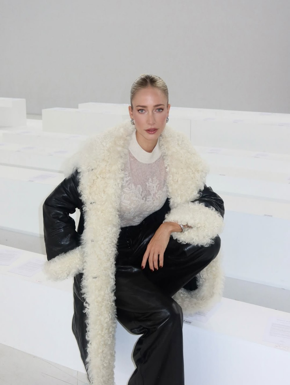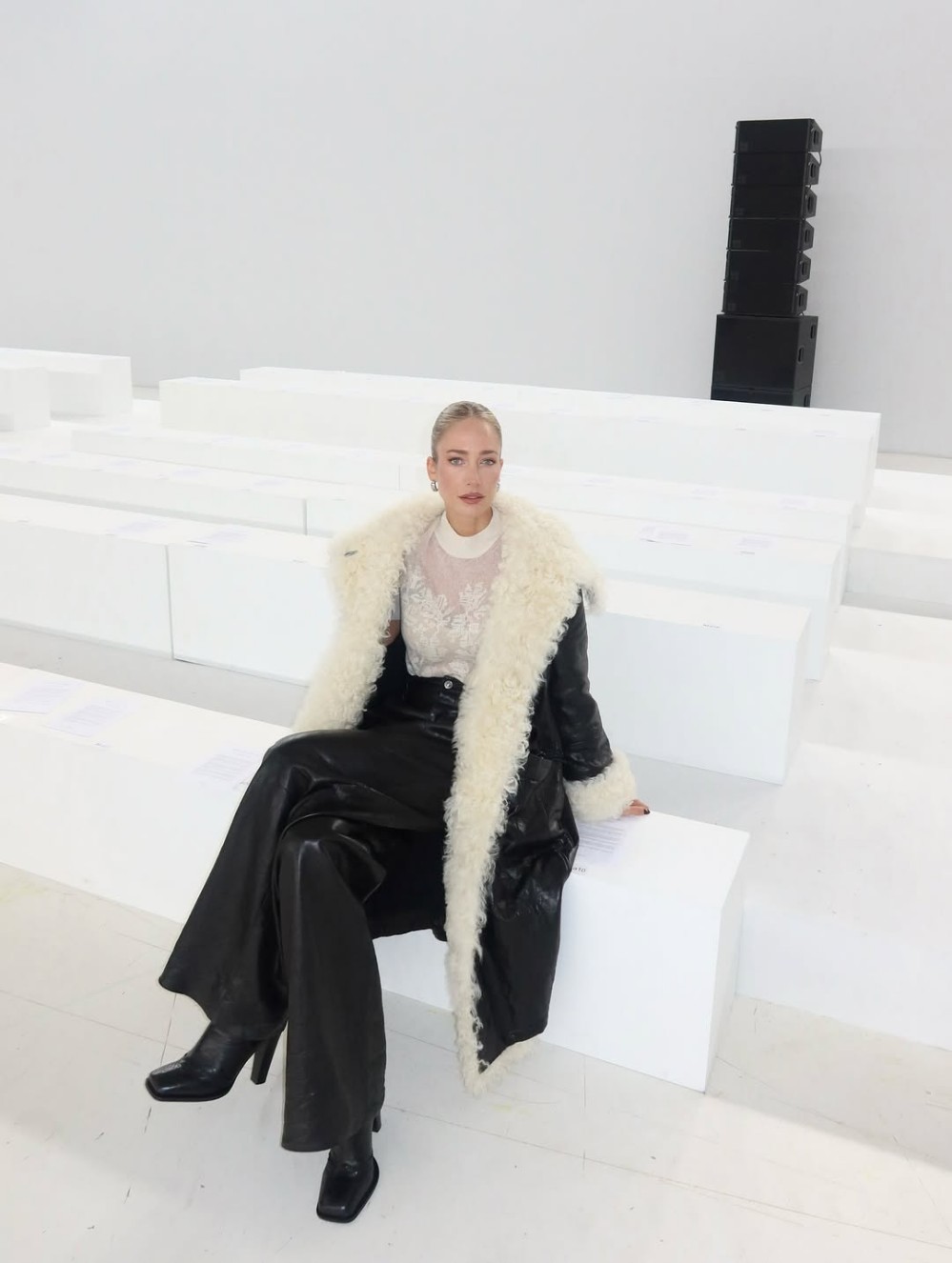 Το Afghan coat, γνωστό για τη χαρακτηριστική του γούνινη επένδυση και τα περίτεχνα κεντήματα, αποκτά στα χέρια της Ευαγγελινού μια νέα, αστική διάσταση. Το μαύρο δέρμα αντικαθιστά τη συνηθισμένη shearling υφή, χαρίζοντας ένταση και βάθος, ενώ τα leather pants ενισχύουν την αίσθηση ισχύος και αυτοπεποίθησης. Την ίδια στιγμή, το see-through πλεκτό πουλόβερ προσφέρει μια πιο ευαίσθητη και αισθησιακή νότα, δημιουργώντας ένα παιχνίδι φωτός και διαφάνειας που αφήνει το βλέμμα να ταξιδέψει χωρίς υπερβολές.