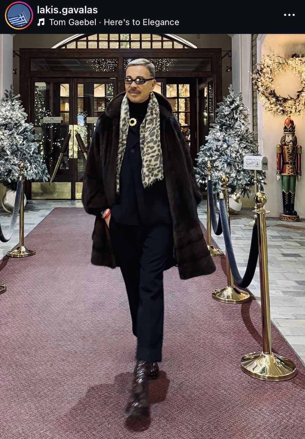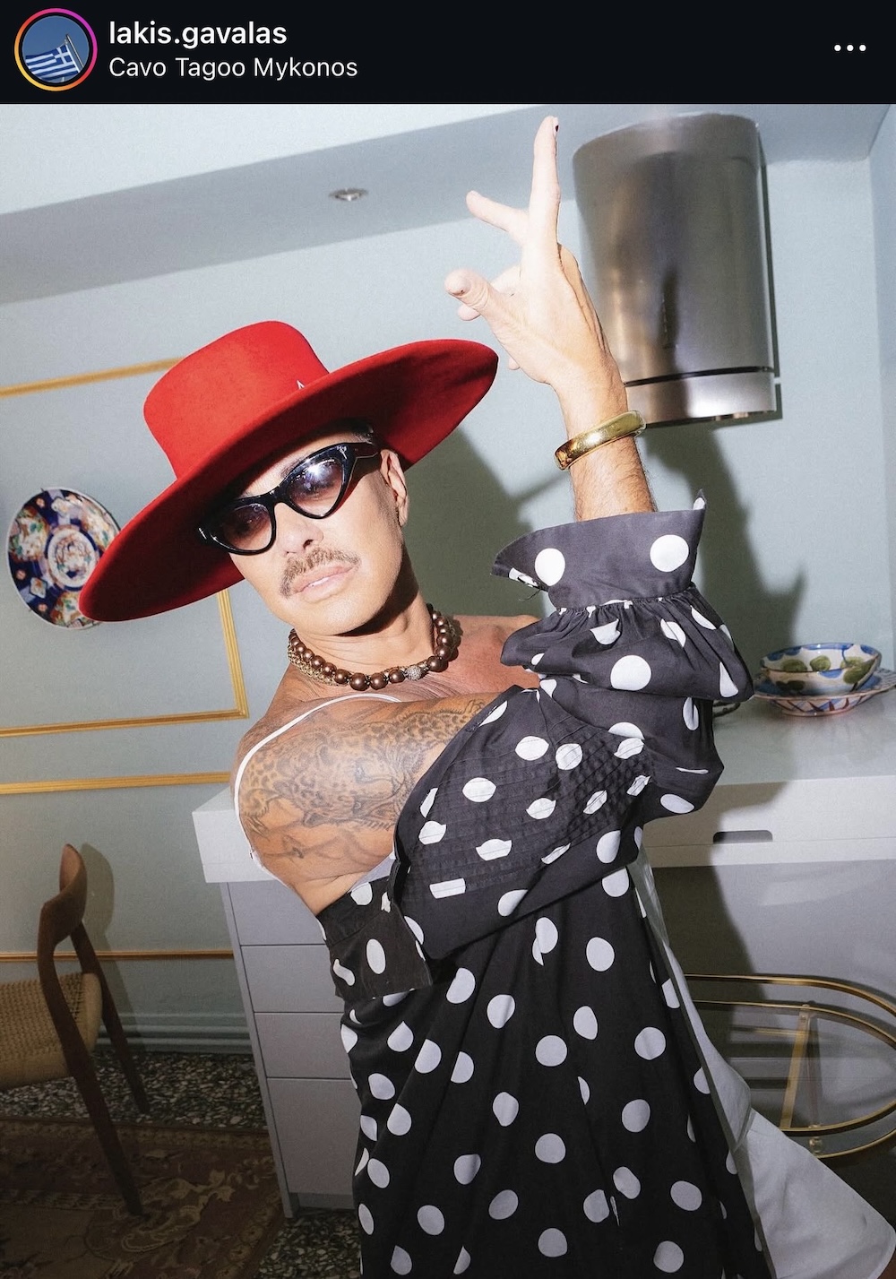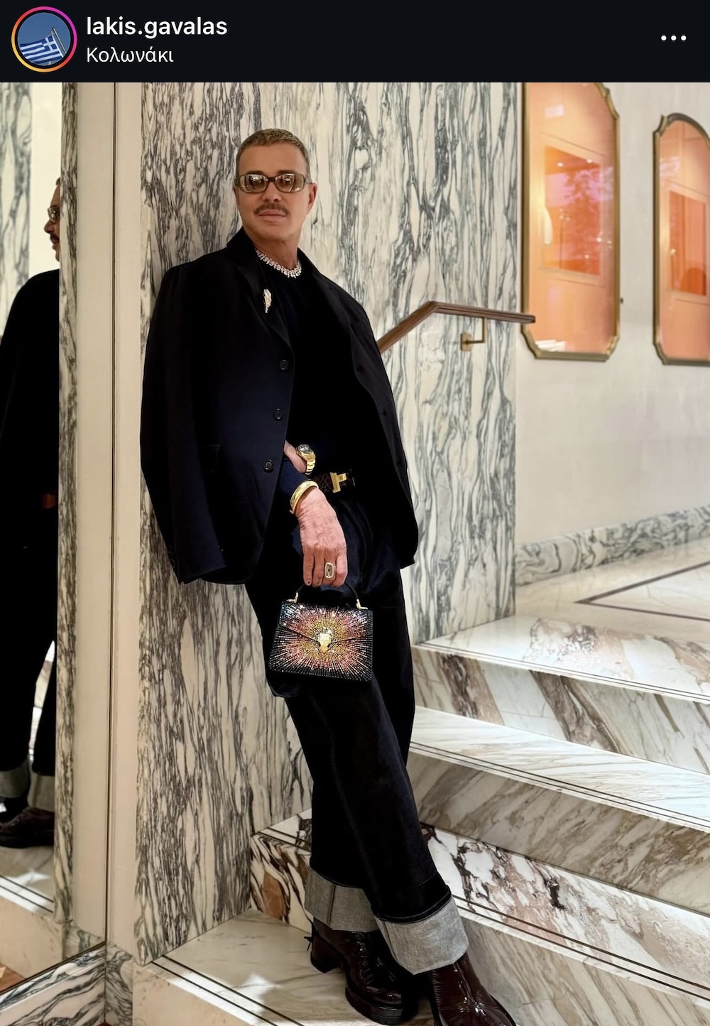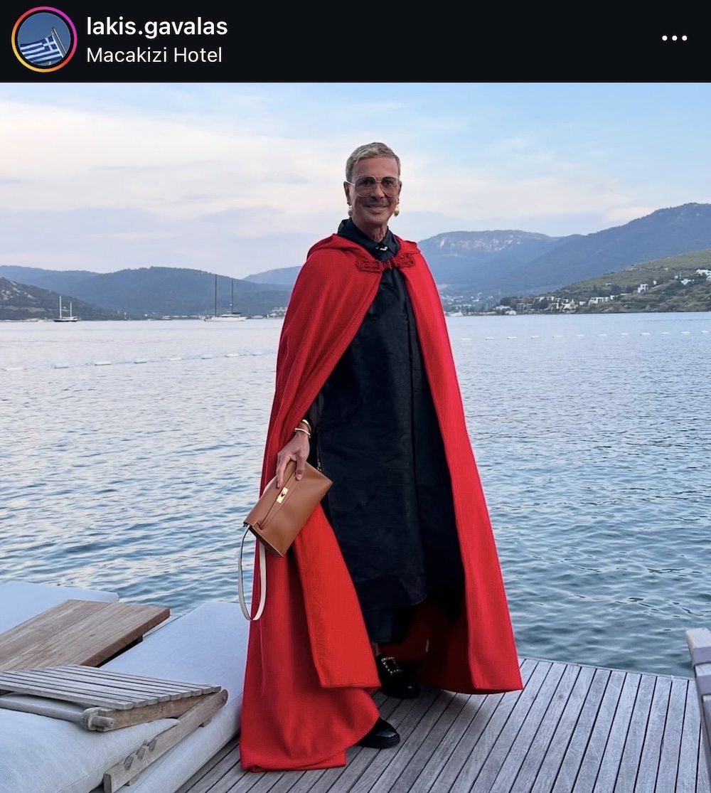 Το εκκεντρικό ντύσιμο του Λάκη Γαβαλά δεν είναι μεταμφίεση. Είναι αρχειακή πράξη. Κάθε κάπα, κάθε πουά, κάθε καπέλο, κάθε ακραία σιλουέτα λειτουργεί σαν αναφορά. Στην Elsa Schiaparelli, στον Patou, στο θέατρο, στο cabaret, στη δεκαετία του ’70, στην queer κουλτούρα, στη μόδα σαν τέχνη και σαν σχόλιο. Ο Γαβαλάς δεν φοράει «ρούχα». Φοράει γνώση ενσωματωμένη στο σώμα. Γι’ αυτό και η εκκεντρικότητά του δεν μοιάζει ποτέ με καρικατούρα. Είναι πάντα συγκεκριμένη. Μελετημένη. Σαν να ξέρει ακριβώς γιατί στέκεται έτσι, γιατί κρατά αυτό το αντικείμενο, γιατί σηκώνει το χέρι με αυτόν τον τρόπο. Και εδώ αρχίζει να γίνεται ενδιαφέρον το αντίθετο άκρο.