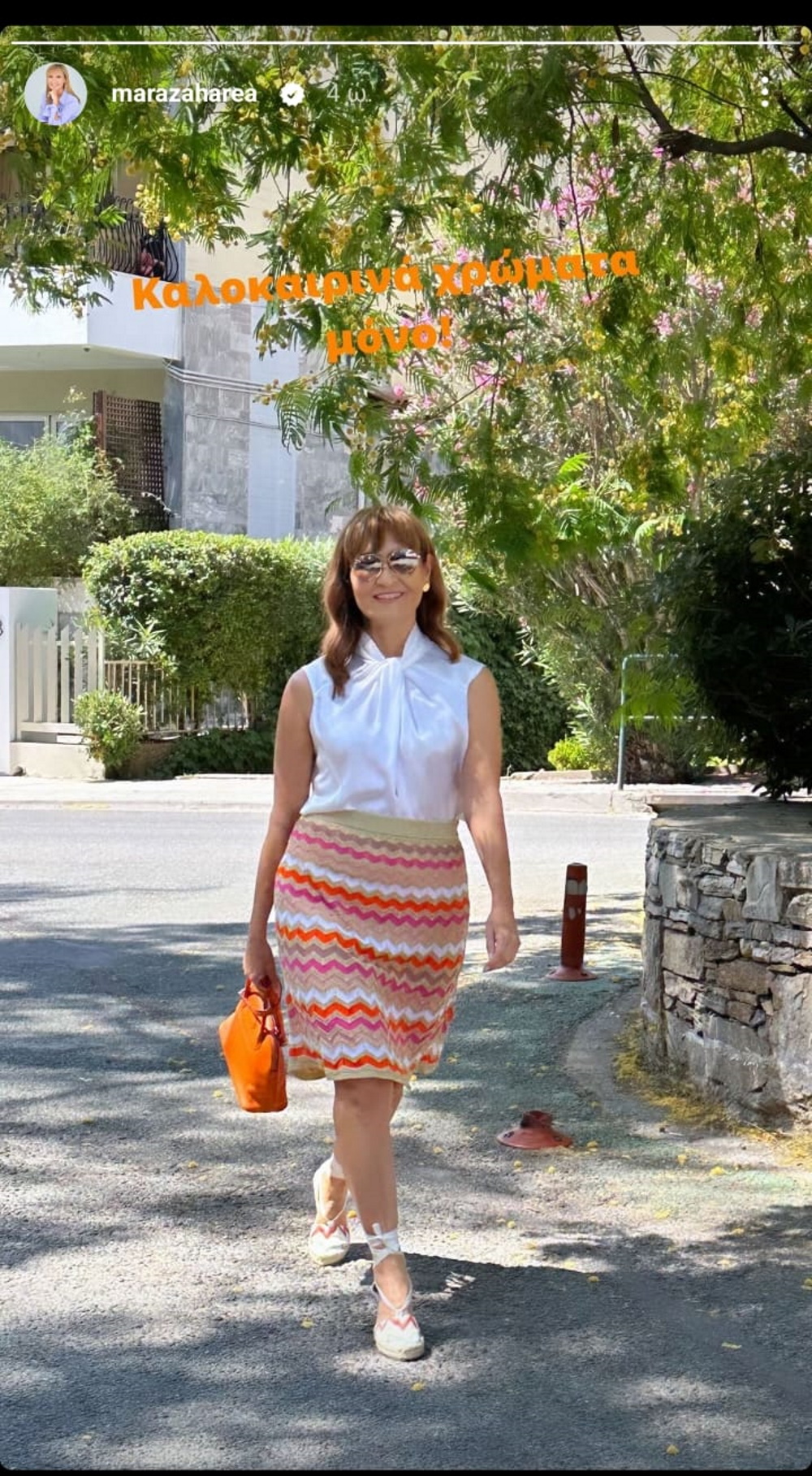 Και μπορεί στο δελτίο ειδήσεων να επιλέγει αυστηρά κοστούμια και σύνολα, ωστόσο στην καθημερινότητά της κάνει πιο casual επιλογές. Tην Τετάρτη η Μάρα Ζαχαρέα επέλεξε ένα σύνολο με λευκό κομψό τοπ και πλεκτή φούστα σε pencil γραμμή σε στυλ Μissoni σε χαρούμενα χρώματα.