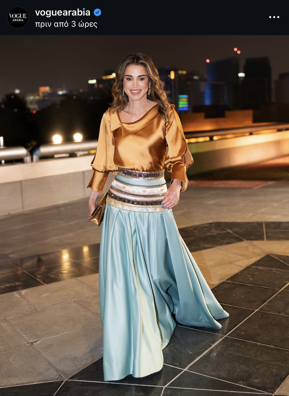 Η Queen Rania Al Abdullah εμφανίστηκε με ένα gold satin structured top με sculpted neckline και puffed satin sleeves με narrow cuff, μια λεπτομέρεια που πρόσθετε όγκο στον ώμο και καθαρή γραμμικότητα στο χέρι. Συνδύασε το top με μια aqua flowing silk skirt, όπου το στοιχείο-υπογραφή ήταν η beaded embroidered waistband, ένα ενσωματωμένο, κεντημένο panel με ethnic μοτίβα, χαρακτηριστικό παράδειγμα Middle Eastern craftsmanship και couture τεχνικής. Ολοκλήρωσε την εμφάνιση με ένα gold clutch, δημιουργώντας ένα look που κινήθηκε ανάμεσα στο regal modernism και την αψεγάδιαστη λεπτομέρεια των παραδοσιακών εργαστηρίων της περιοχής.