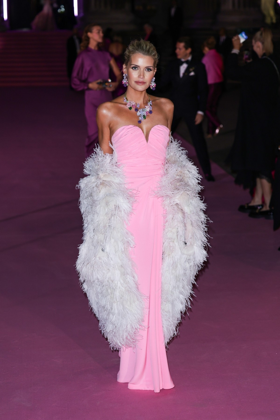 Η μεγαλύτερη αδελφή τους, Κίτι Σπένσερ, προφύλαξε τον εαυτό της από το φθινοπωρινό κρύο με ένα φτερωτό shrug καθώς περπατούσε στο ροζ χαλί, συνδυάζοντάς το με ένα floral κολιέ και αντίστοιχα σκουλαρίκια. Η τουαλέτα που επέλεξε έφερε ένα υπέροχο heart shaped neckline σε ντραπέ ύφασμα.