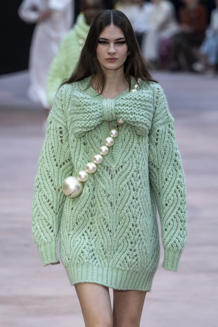 Η Chanel το απέδειξε περίτρανα στη Fall/Winter 2025–2026 συλλογή της. Ένα mint green chunky knit με έναν υπερμεγέθη φιόγκο, συνδυασμένο με μια jumbo τσάντα-μαργαριτάρι, έδειξε πως ακόμα και το πιο βαρύ πλεκτό μπορεί να κουβαλάει μια girly καρδιά.