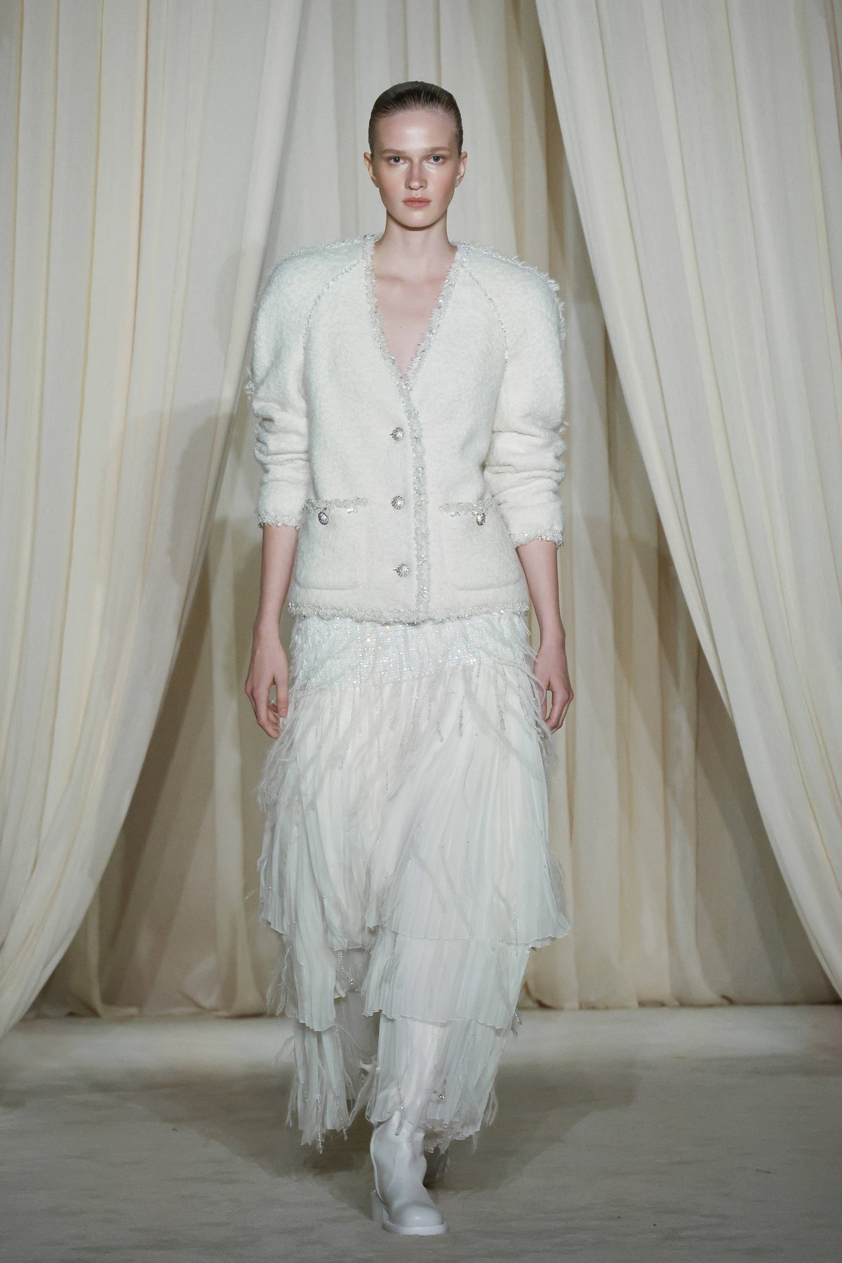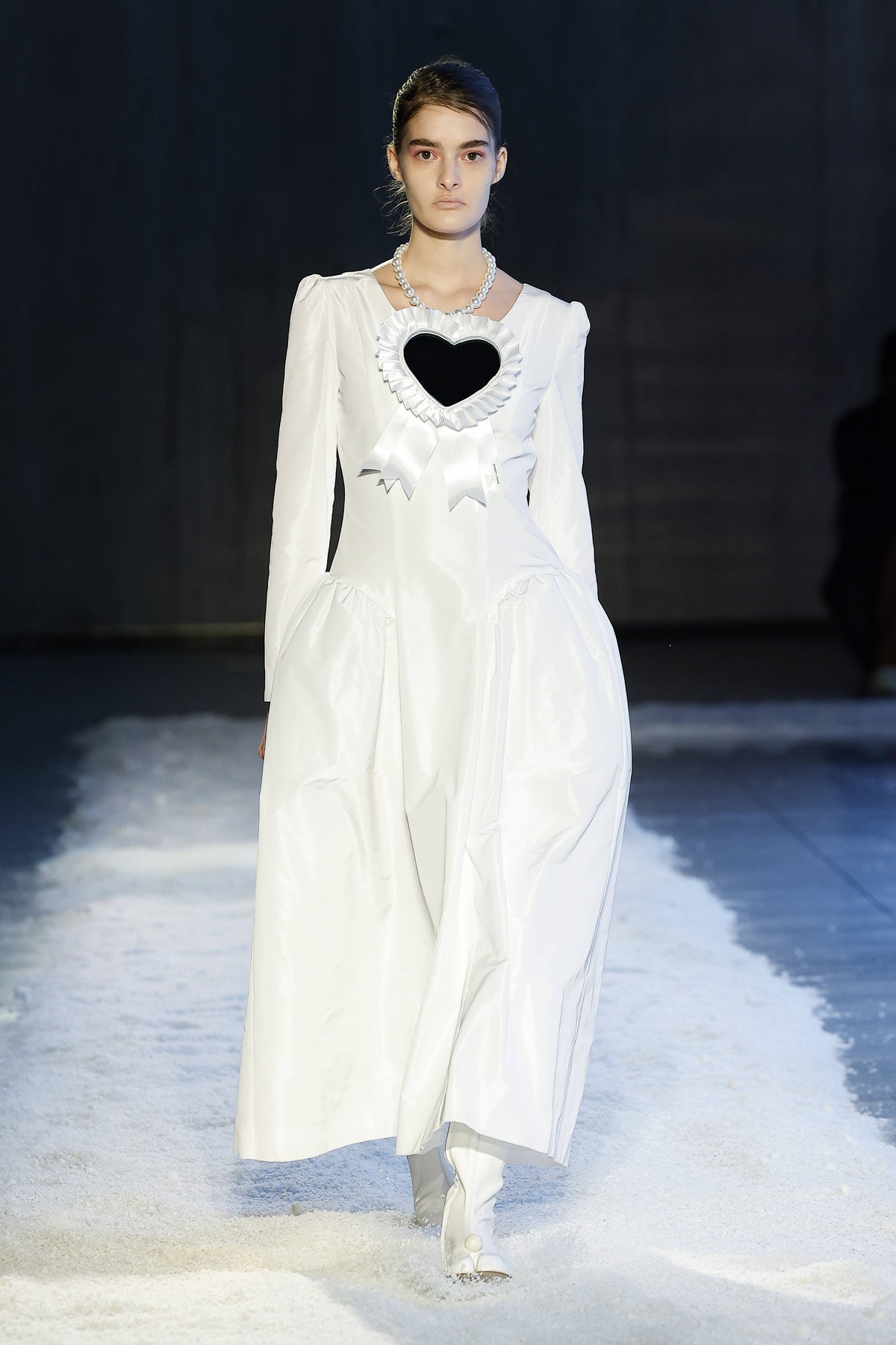 Στον οίκο Sandy Liang, ένα ολόλευκο look με κορσέ, puffed shoulders, καρδιά από βολάν και πέρλες απέδειξε πως “χειμώνας” δεν σημαίνει αναγκαστικά σκοτεινός.