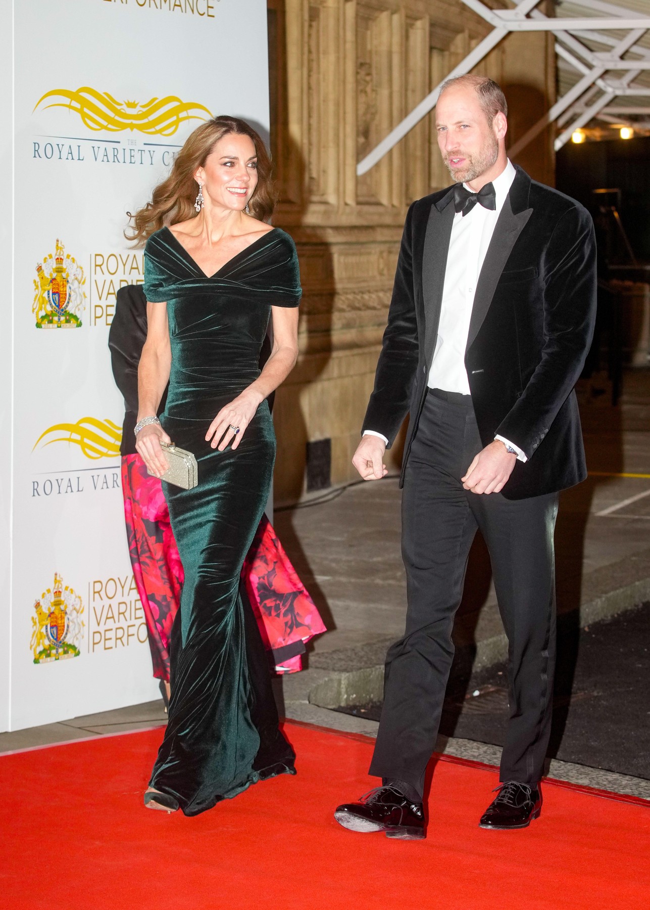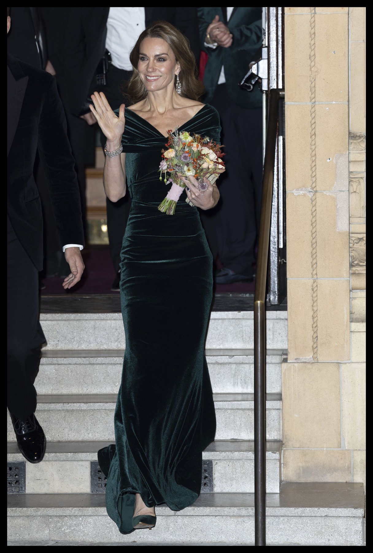 Για την περίσταση, η πριγκίπισσα Κάθριν επέλεξε ένα μακρύ βελούδινο off thw shoulder φόρεμα σε σκούρο πράσινο της Talbot Runhof που κοστίζει περίπου 1.800 ευρώ, που συνδύαζε τη σύγχρονη αισθητική με τη διαχρονική κομψότητα. Η απαλή εφαρμογή αγκάλιαζε τη σιλουέτα της, ενώ το ντεκολτέ που άφηνε τους ώμους ακάλυπτους προσέδιδε μία διακριτική αίσθηση πολυτέλειας και φινέτσας — ένα look ιδανικό για την έναρξη της γιορτινής περιόδου.