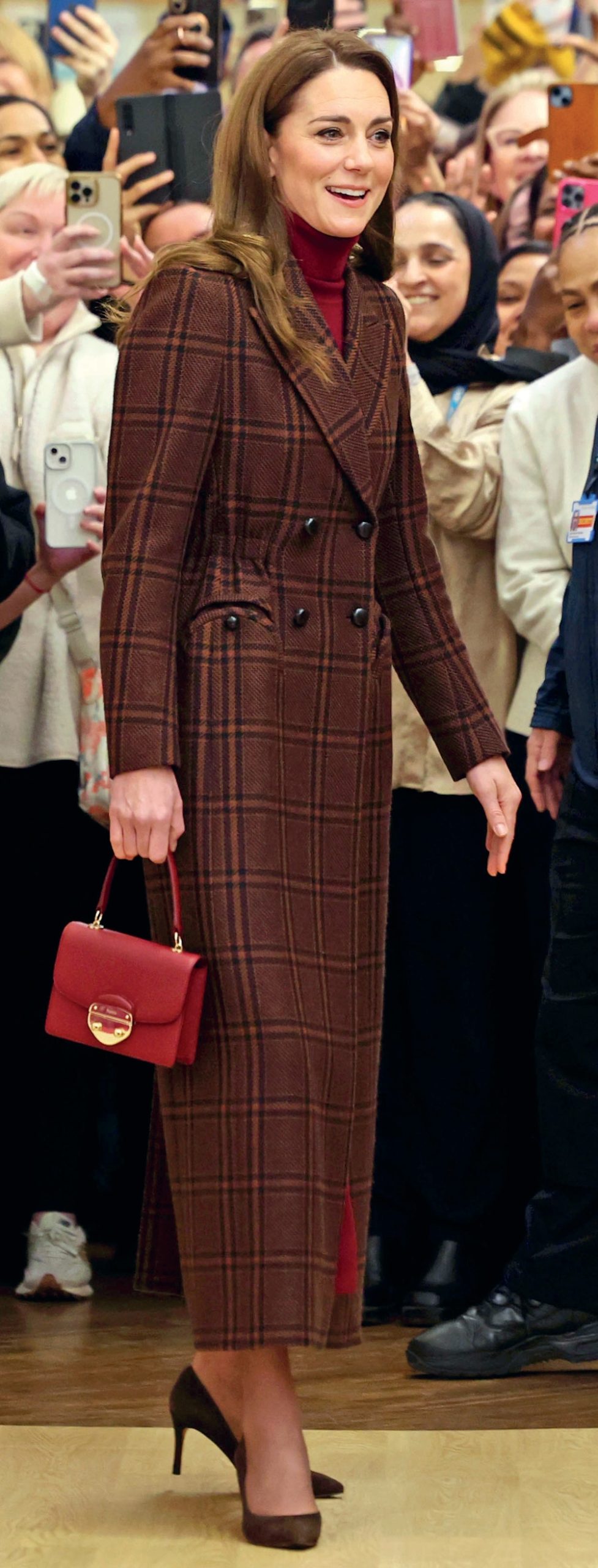 H πριγκίπισσα Κάθριν εμφανίστηκε με παλτό Blazé Milano, τοπ Kiltane και φούστα Edeline Lee ενώ κράτησε μια Morgan 18 Handbag σε “Cranberry” χρώμα από τον οίκο Asprey αξίας 3.500 ευρώ περίπου.