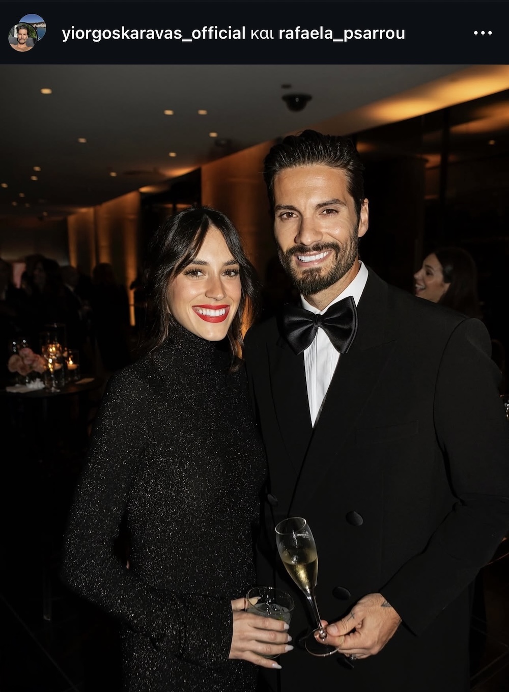 Ο Γιώργος Καράβας έχει μια δυνατή δημόσια εικόνα που γεμίζει τον χώρο. Ψηλός, επιβλητικός, με χρόνια πορείας στη μόδα. Παρ όλα αυτά η Ραφαέλα δεν αλλάζει ύφος στις κοινές τους εμφανίσεις. Δεν προσπαθεί να τον ανταγωνιστεί. Δεν προσπαθεί να προσαρμοστεί σε εκείνον. Είναι μια παρουσία που στέκεται δίπλα του με τον δικό της ρυθμό.