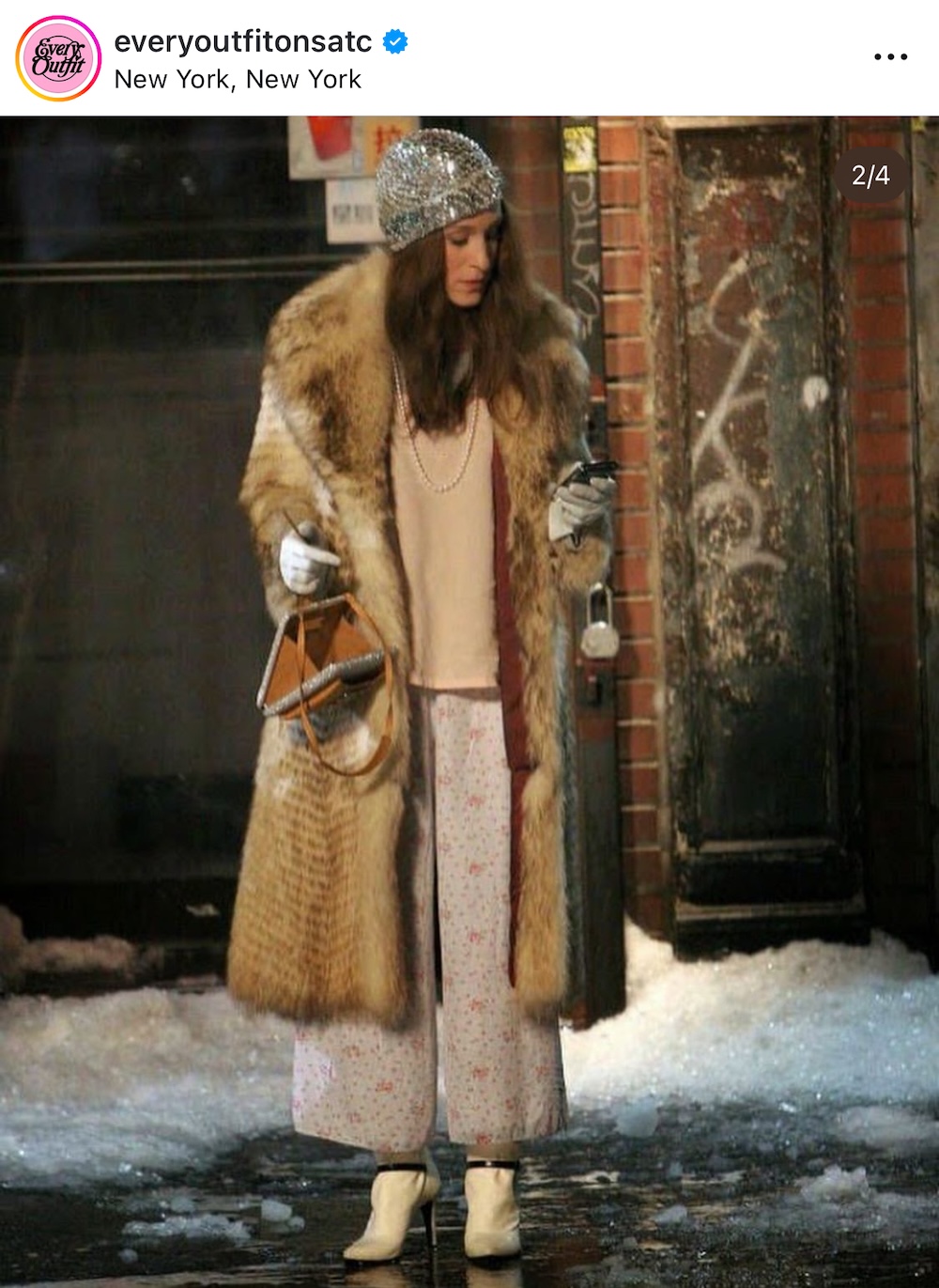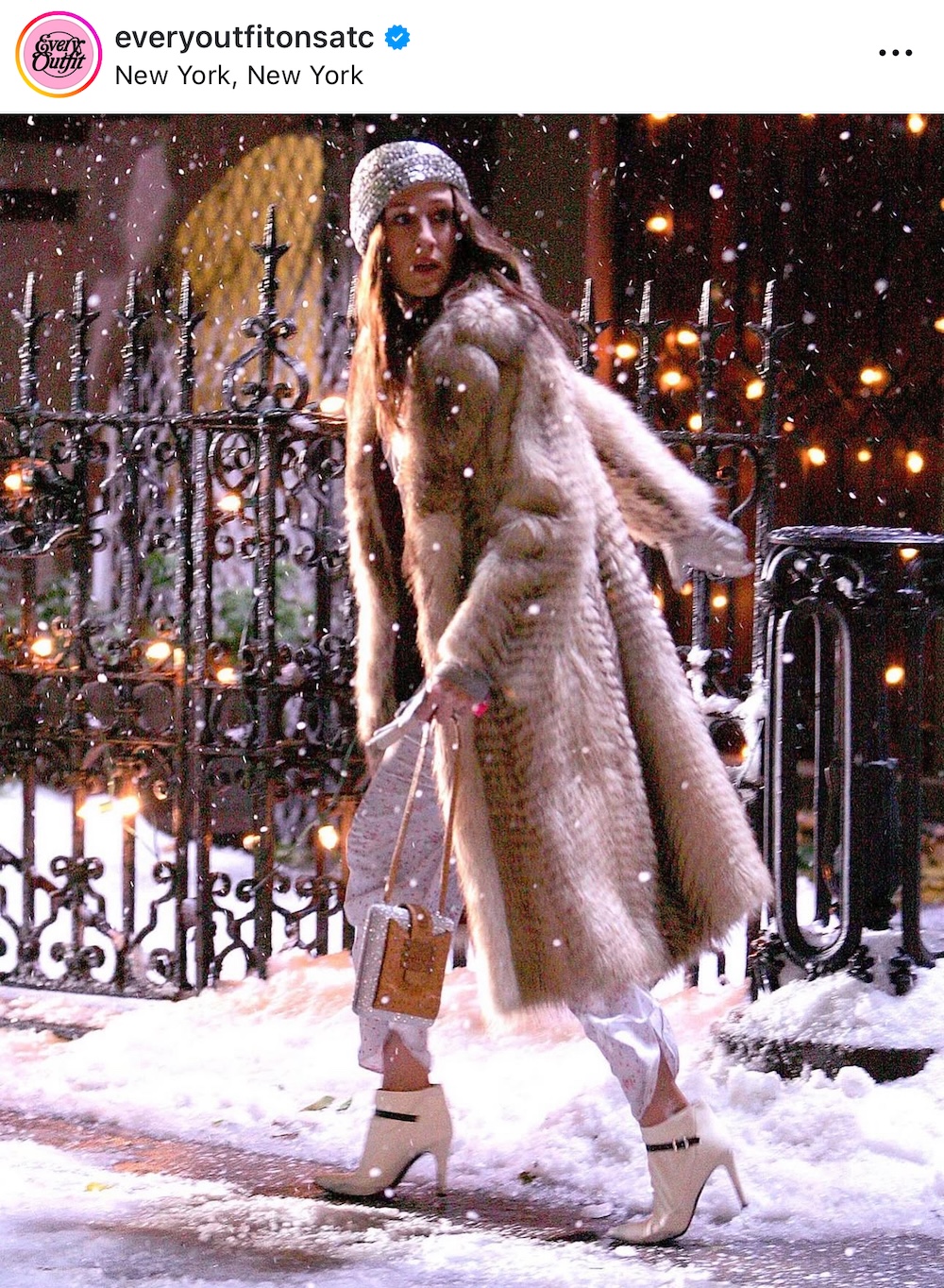 Η επιλογή του συγκεκριμένου head piece ήταν τόσο επιτυχημένη όσο και πρακτική. Συνδέθηκε με μια πολύ συναισθηματική κινηματογραφική σκηνή και με την προσπάθεια της Carrie να συμπαρασταθεί στη φίλη της που βρέθηκε σε μια στιγμή προσωπικής κρίσης και ανάγκης για υποστήριξη, όλα αυτά εναρμονισμένα με τις. Αμελές θερμοκρασίες και τη festive ατμόσφαιρα. Μας θυμίζει πόσο πολύ η μόδα, πολλές φορές χωρίς να το συνειδητοποιούμε, συμπορεύεται με τις ζωές μας και μεταδίδει μηνύματα.