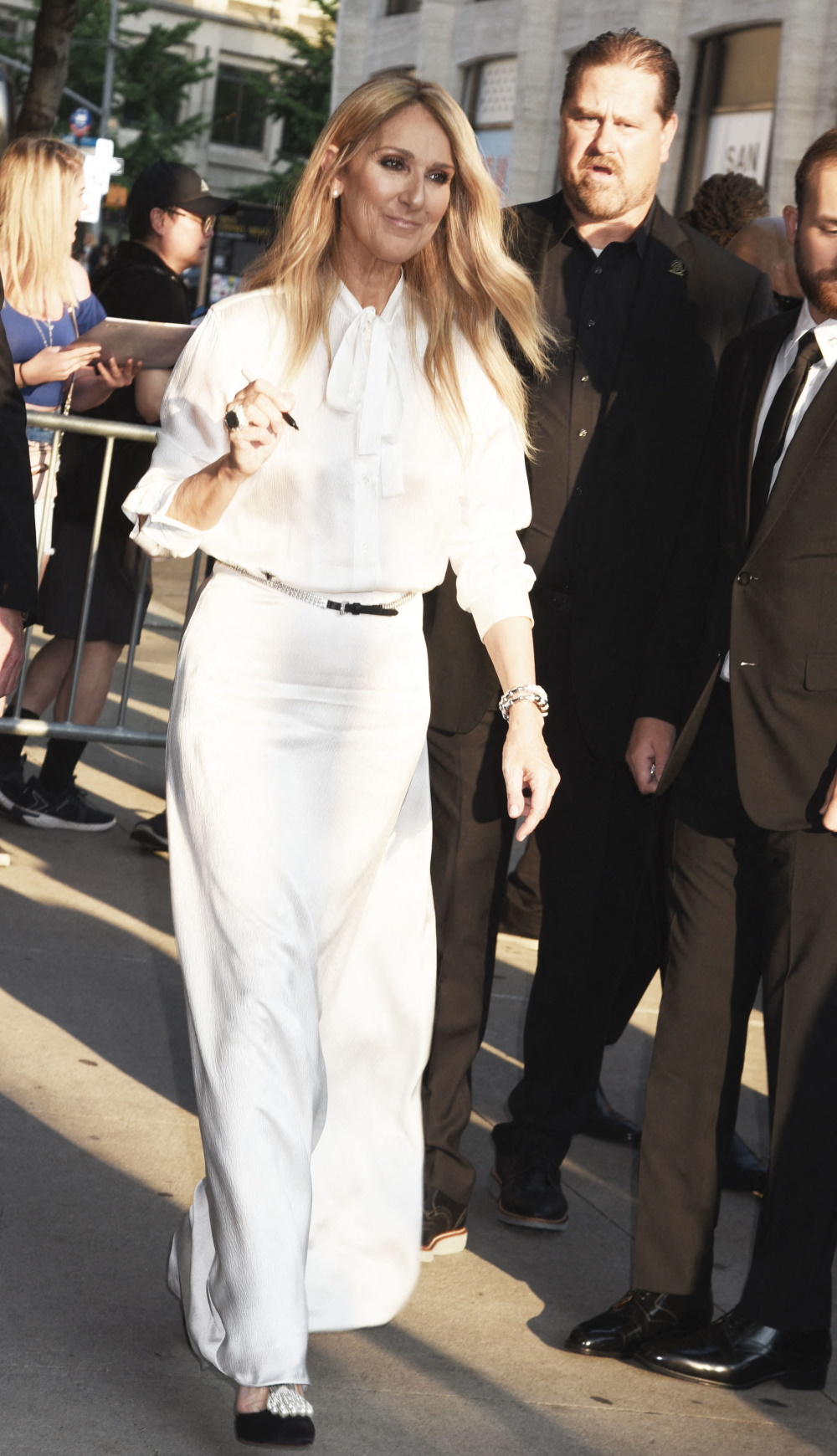 Η Ντιόν επέλεξε μια μεταξένια μάξι φούστα και ένα ασορτί πουκάμισο με γιακά με φιόγκο. Απόλυτη λεπτομέρεια, η μαύρη micro ζώνη. Όταν ανέβηκε στη σκηνή για να παρουσιάσει το ντοκιμαντέρ της, η Σελίν Ντιόν, συγκινημένη με δάκρυα, εκφώνησε μια ομιλία που τελείωσε με αυτά τα λόγια: «Ελπίζω να σας ξαναδώ σύντομα, πολύ σύντομα».