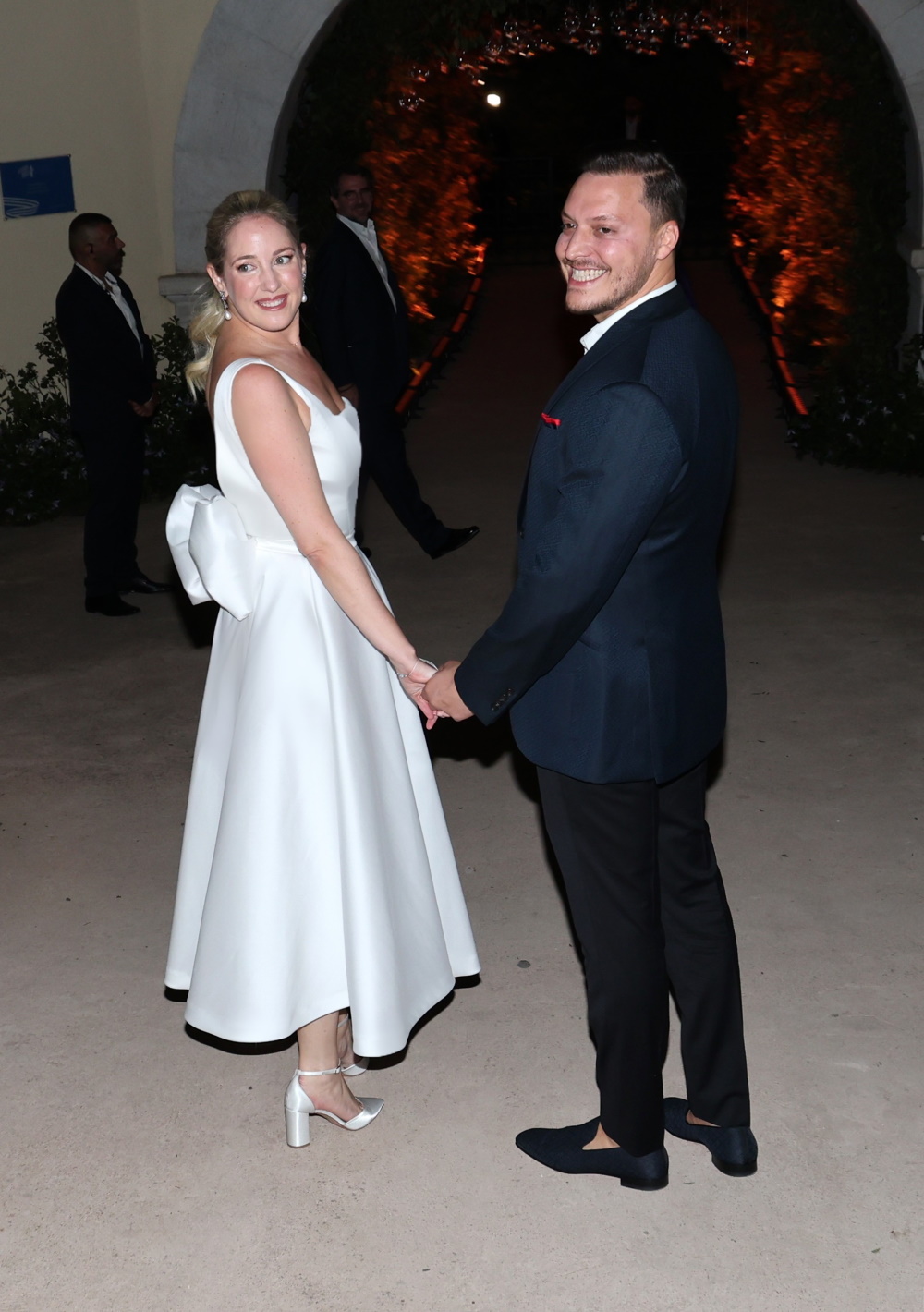 Το εντυπωσιακό outfit που μαγνήτισε τα βλέμματα όλων των καλεσμένων, συμπλήρωσαν λαμπερά σκουλαρίκια και clutch, αλλά και οι λευκές γόβες, όλα απόλυτα συνυφασμένα με την δημιουργία της Ελληνίδας σχεδιάστριας.
