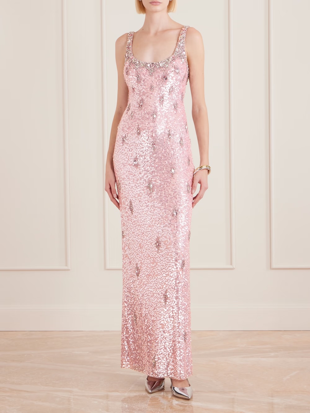 Το ροζ αυτής της gown δεν είναι “γλυκό”, είναι ακριβές. Το φως που αντανακλάται στις παγιέτες έχει την πειθαρχία ενός παλιού Hollywood. Η γραμμή πέφτει κατακόρυφα, χωρίς φιλολογικές υπερβολές.