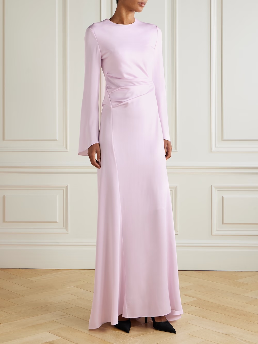 Οι καθαρές γραμμές, η ελαφριά πτύχωση, η σατινέ επιφάνεια που παγιδεύει το φως χωρίς να το κρατά. Είναι ένα φόρεμα που δεν χρειάζεται στολίδια.