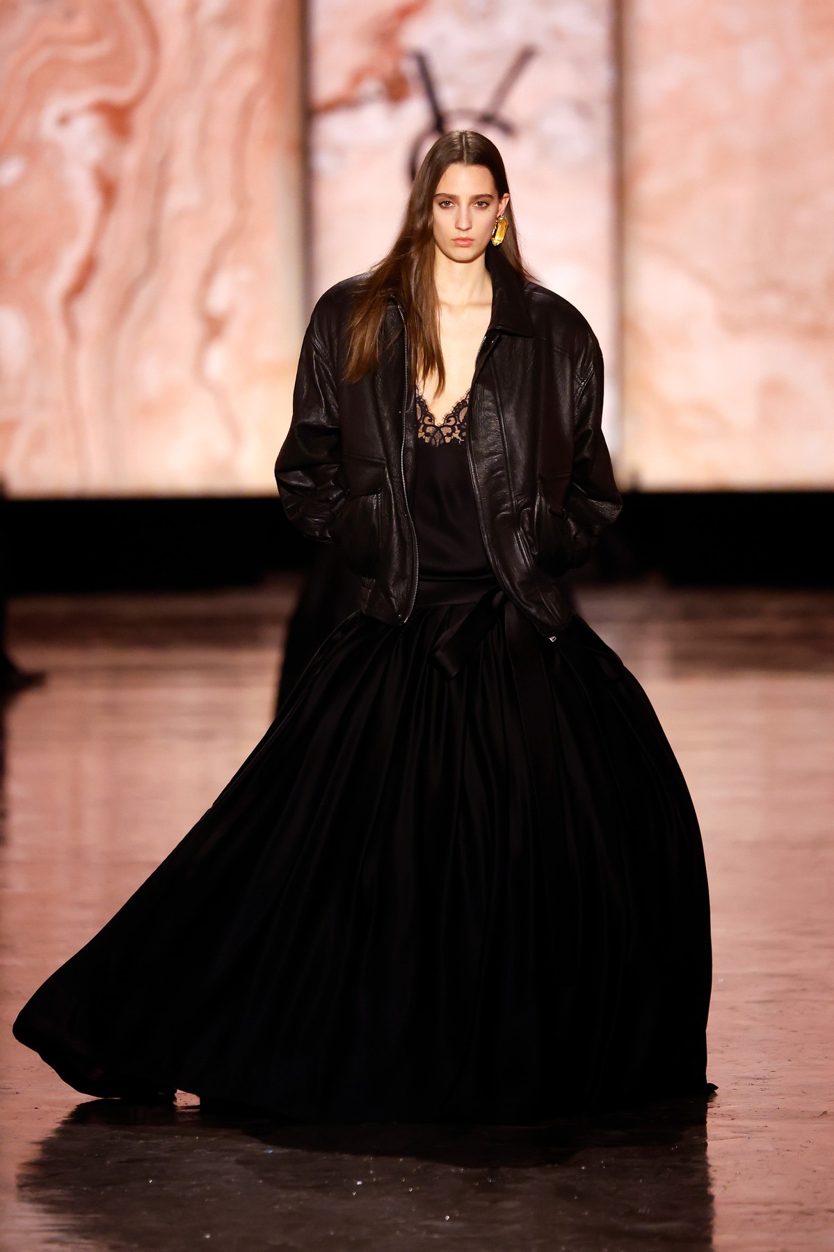 Υπάρχουν πολλά παραδείγματα στη μόδα: techy jackets ή bomber με ball gowns/formal wear, όπως στον Saint Laurent FW25, ή sports jackets/utility coats πάνω από υπερθηλυκές σιλουέτες, όπως στη Miu Miu FW25, συνδυάζοντας πλεκτά και pencil skirts με «dad» jackets στολισμένα με λαμπερά pins.