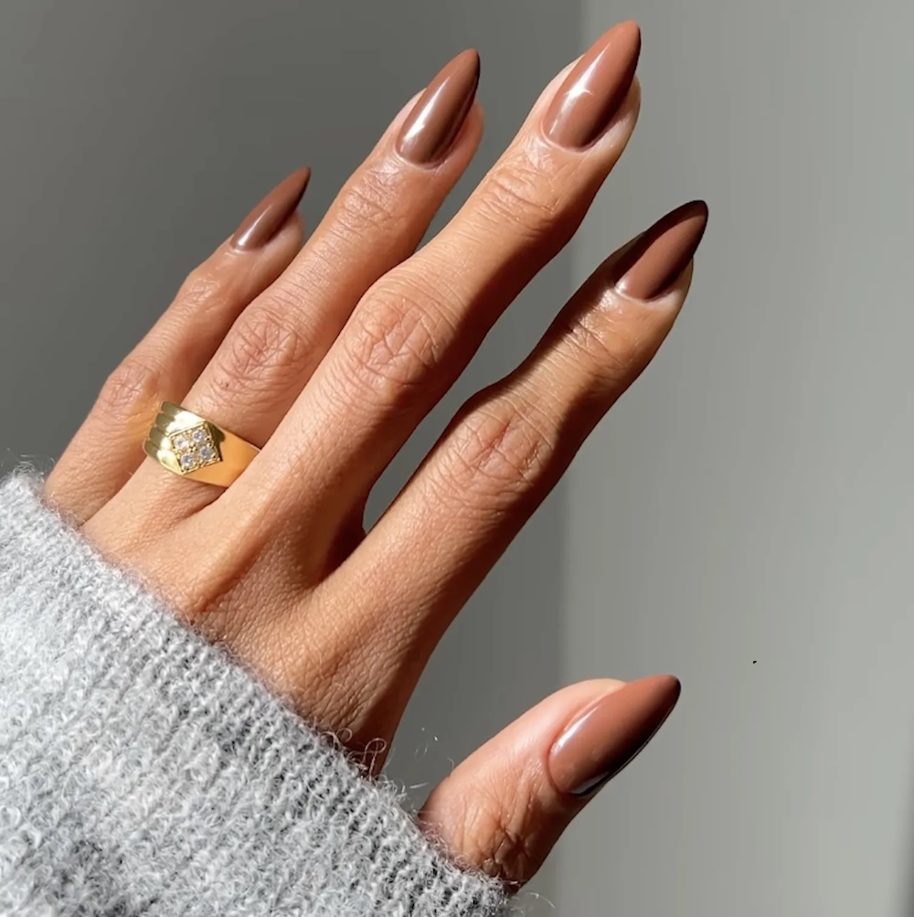 Η κλασική εκδοχή του chai latte nails συνδυάζει ένα απαλό beige με καφέ τόνους, που μπορείτε να παίξετε μεταξύ τους για να δημιουργήσετε διακριτικά gradients ή ακόμη και ένα minimal ombré.