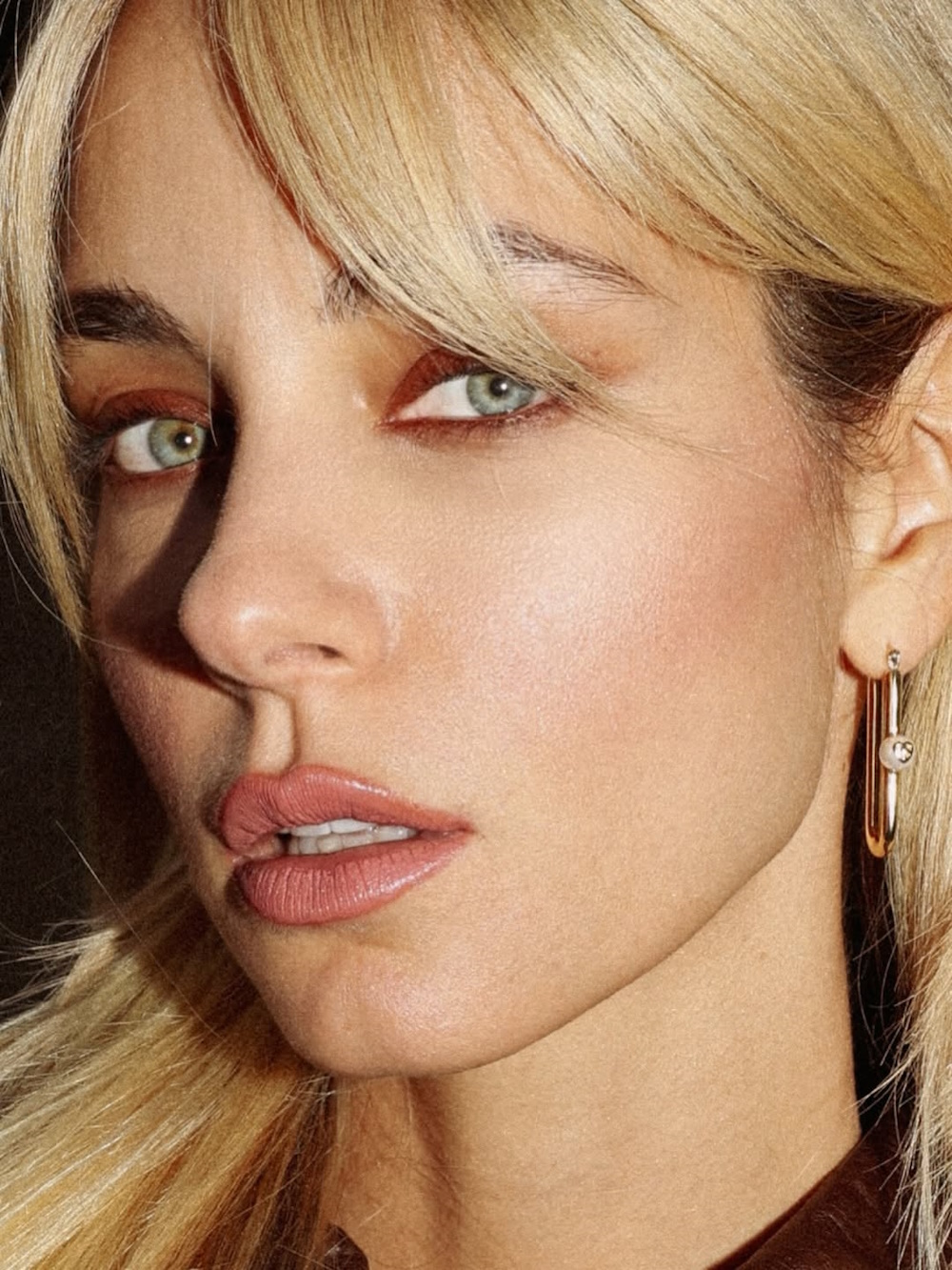 Τα μάτια αποτέλεσαν το επίκεντρο, με απαλές σοκολατί σκιές που σβήνουν ομαλά προς τις άκρες, δημιουργώντας ένα διακριτικό smoky effect γεμάτο βάθος. Οι ζεστές καφεκόκκινες πινελιές ενίσχυσαν το βλέμμα, προσθέτοντας ένταση και εκφραστικότητα, χωρίς όμως να βαραίνουν το πρόσωπο.