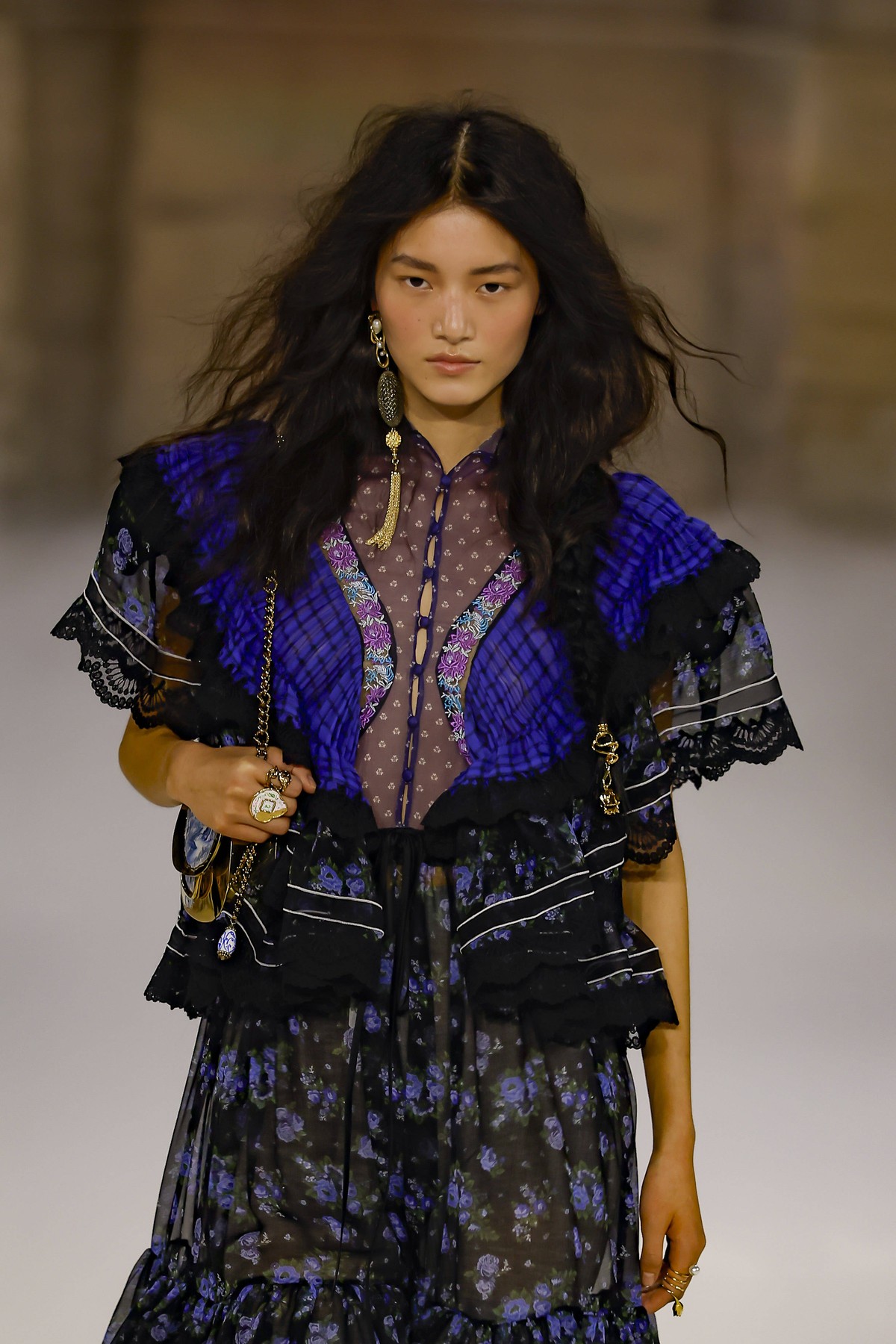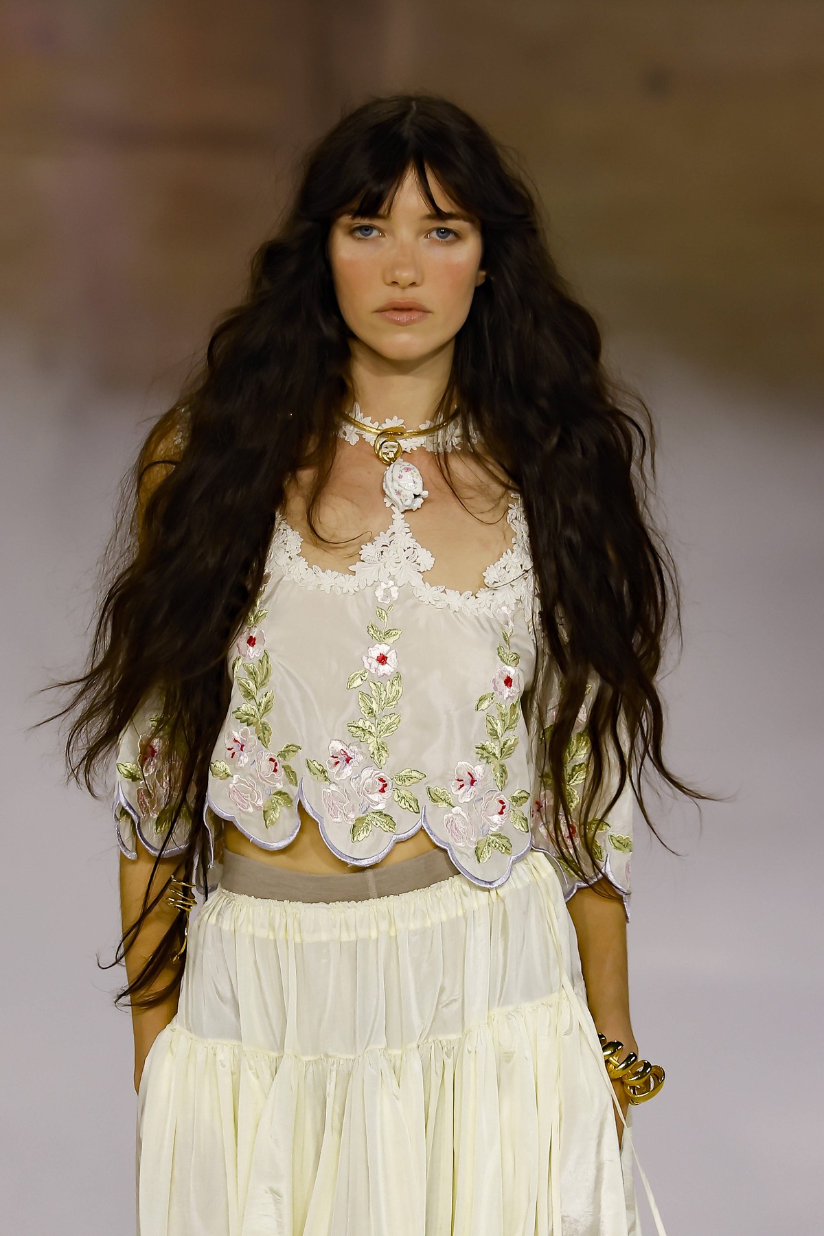 Παράλληλα, τα φρύδια επιστρέφουν στη φυσική τους μορφή – πυκνά, ανορθωμένα και ελαφρώς ατημέλητα, δίνοντας έμφαση στο οστό του μετώπου και «ανοίγοντας» το βλέμμα χωρίς τη χρήση έντονης σκιάς. Στα μαλλιά, η τάση είναι ο φυσικός κυματισμός (undone waves). Ξεχάστε τις στιλιζαρισμένες μπούκλες. Η Chloé προτείνει μαλλιά που μοιάζουν σαν να στέγνωσαν φυσικά στον αέρα μετά από μια βόλτα στην εξοχή ή τη θάλασσα, διατηρώντας μια κίνηση που ακολουθεί το σώμα σε κάθε βήμα.