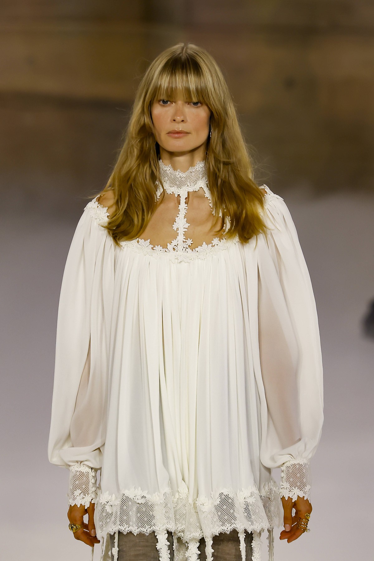 Το fashion show του οίκου έγινε αμέσως viral, όχι μόνο για τα αέρινα βολάν και τις δερμάτινες μπότες πάνω από το γόνατο, αλλά κυρίως για το “effortless cool” beauty look των μοντέλων. Η τάση που κυριάρχησε είναι μια επιστροφή στη δεκαετία του ’70, ιδωμένη μέσα από ένα σύγχρονο, μινιμαλιστικό φίλτρο. Πρόκειται για μια αισθητική που γιορτάζει τη φυσική γυναίκα, εκείνη που δεν ξοδεύει ώρες μπροστά στον καθρέφτη, αλλά καταφέρνει να δείχνει λαμπερή, ελεύθερη και αφοπλιστικά κομψή.