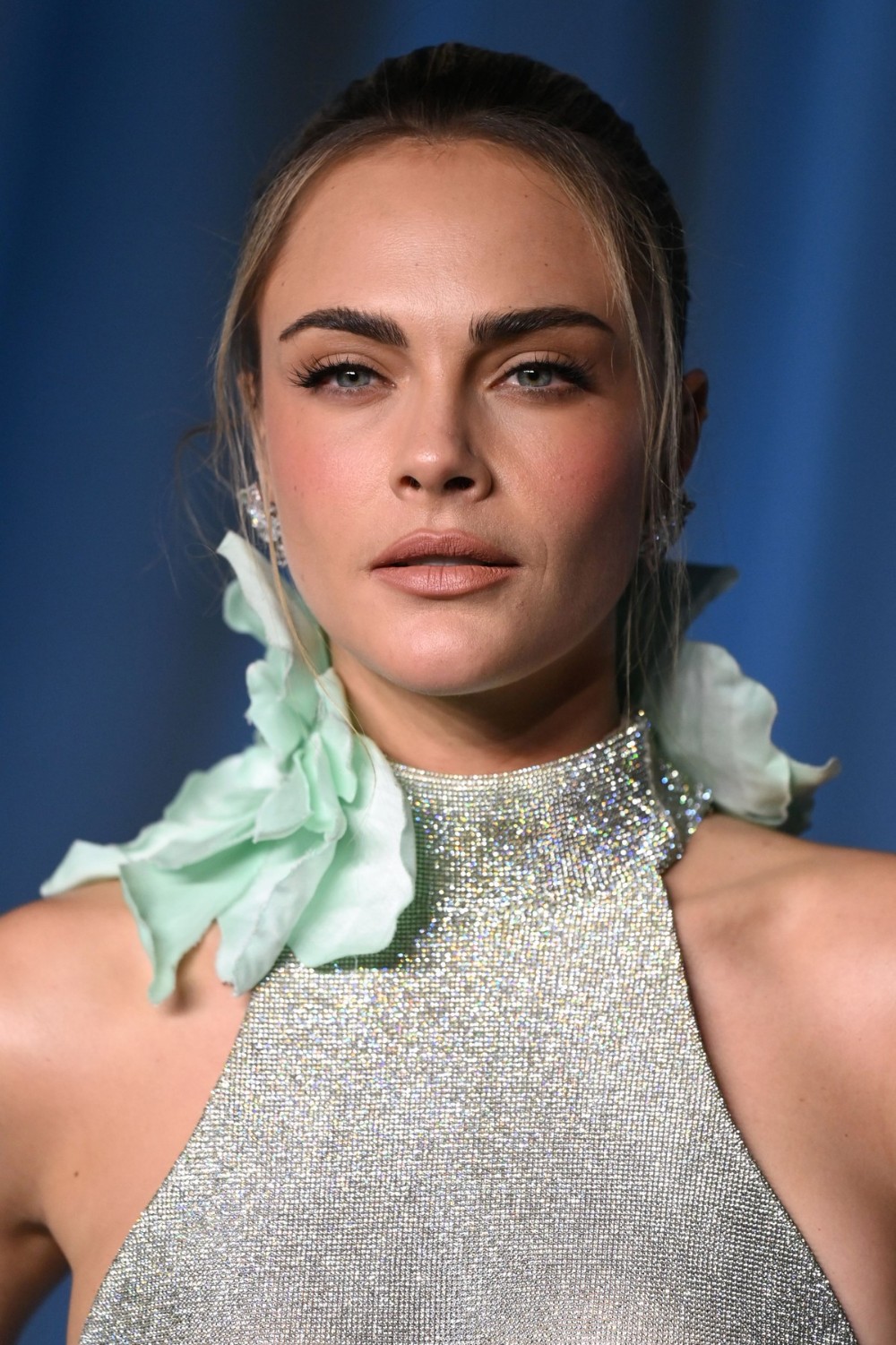 Στο μακιγιάζ, η Κάρα κινήθηκε σε nude αποχρώσεις που χάριζαν στο πρόσωπο φρεσκάδα και φωτεινότητα. Η βάση ήταν ελαφριά, σχεδόν διάφανη, αφήνοντας την υφή της επιδερμίδας να φαίνεται φυσική και καθαρή. Οι βλεφαρίδες, πλούσιες και έντονες, ήταν το κεντρικό σημείο του look, προσδίδοντας βάθος στο βλέμμα χωρίς να χρειαστούν σκιές ή eyeliner. Τα χείλη ντύθηκαν σε μια απαλή ροδακινί nude απόχρωση, ενώ μια διακριτική πινελιά highlighter φώτιζε τα ζυγωματικά.