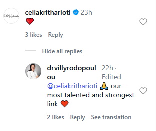 «Ο πιο ταλαντούχος και δυνατότερος κρίκος μας» σχολίασε η πλαστική χειρουργός Βίλλυ Ροδοπούλου στο Instagram απευθυνόμενη στη Celia Kritharioti για τη στενή σχέση των τριών γυναικών.