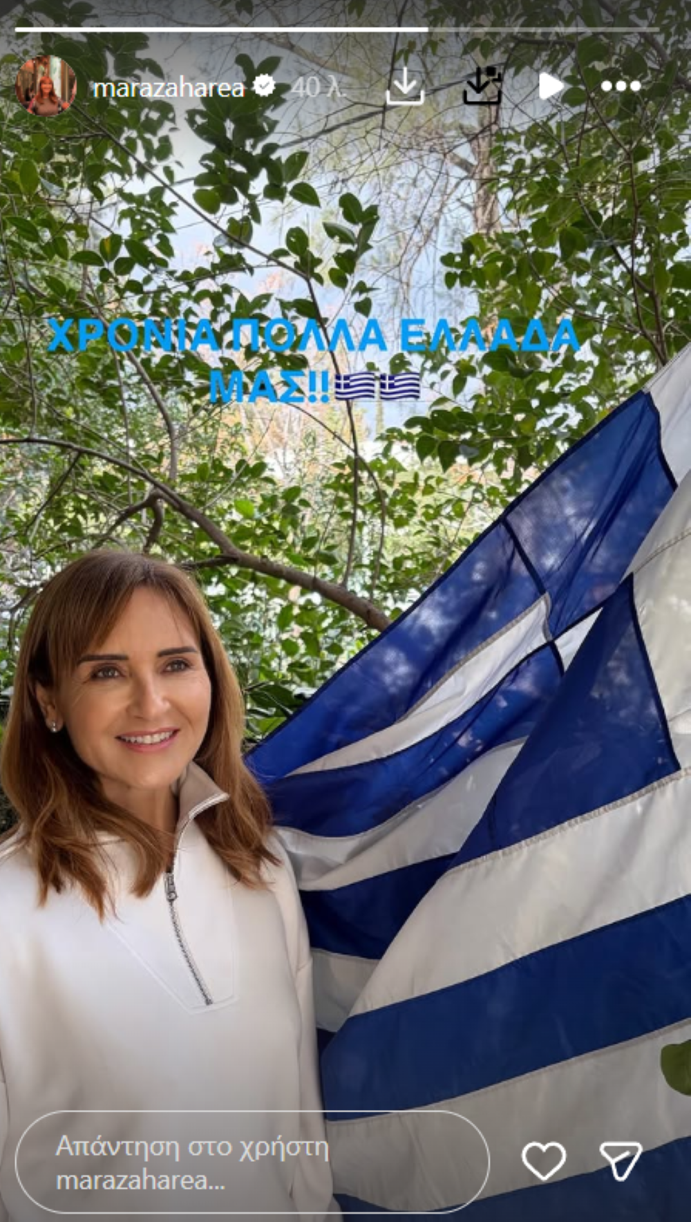 Αντίστοιχα, η Μάρα Ζαχαρέα ανάρτησε φωτογραφία της με φόντο την ελληνική σημαία και το μήνυμα: «Χρόνια πολλά Ελλάδα μας», ενώ η Ελένη Χατζίδου έγραψε: «Χρόνια πολλά! Ζήτω το Έθνος!».